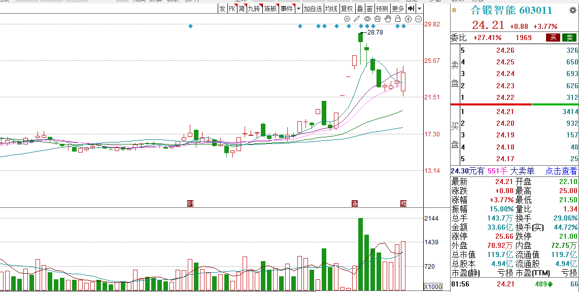 公司是成型机床领域单项冠军,在核聚变核心部件制造领域已经取得了突破性进展。可控核聚变是未来新能源终极目标,有望代替石油等传统能源,有望在2030年实现,市场想象科技还是非常大的。在前期核聚变也是市场热点之一,合锻智能走出了四连板成为板块核心头部。一般核心头部行情都会有反复活跃,该股在14天线重要的短线支撑位明显企稳,这两天明显放量拉升,说明地位开始有新的姿金流入。早盘集合竞价若在水上开还会有震荡,但在23附近支撑比较强。如果能和昨天一样继续放量低开高走,短线冲击前高的机会就非常大了。因此策略是弱转强再研究,水下震荡继续观望为主。