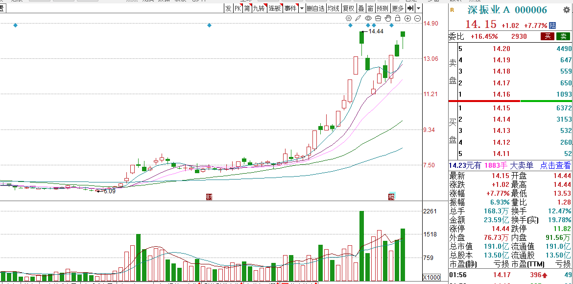 公司是一家地产公司,最大亮点是深圳国资控股地产平台,未上市的优质资产和城投资产数量非常庞大,资产注入其实是最明朗的。在前期的拉升中,炒热主要逻辑也是资产并购,也是最先开始启动,是核心龙头。刚刚颁布的深圳并购重组方案中,必须将未上市优质资产快速注入到上市平台,而深振业又是地产上市平台的核心,想象空间是巨大的。技术上,趋势还是明显向上,目前刚好是前期高点压力位,昨日涨停板开盘被打开,但大单是大幅净流入,这个位置分化若能再转一致就是突破高点开启新一轮行情。早盘开盘若能继续走强,走突破行情概率就非常大了。如在水下震荡还继续观望,策略是水上走强再研究。