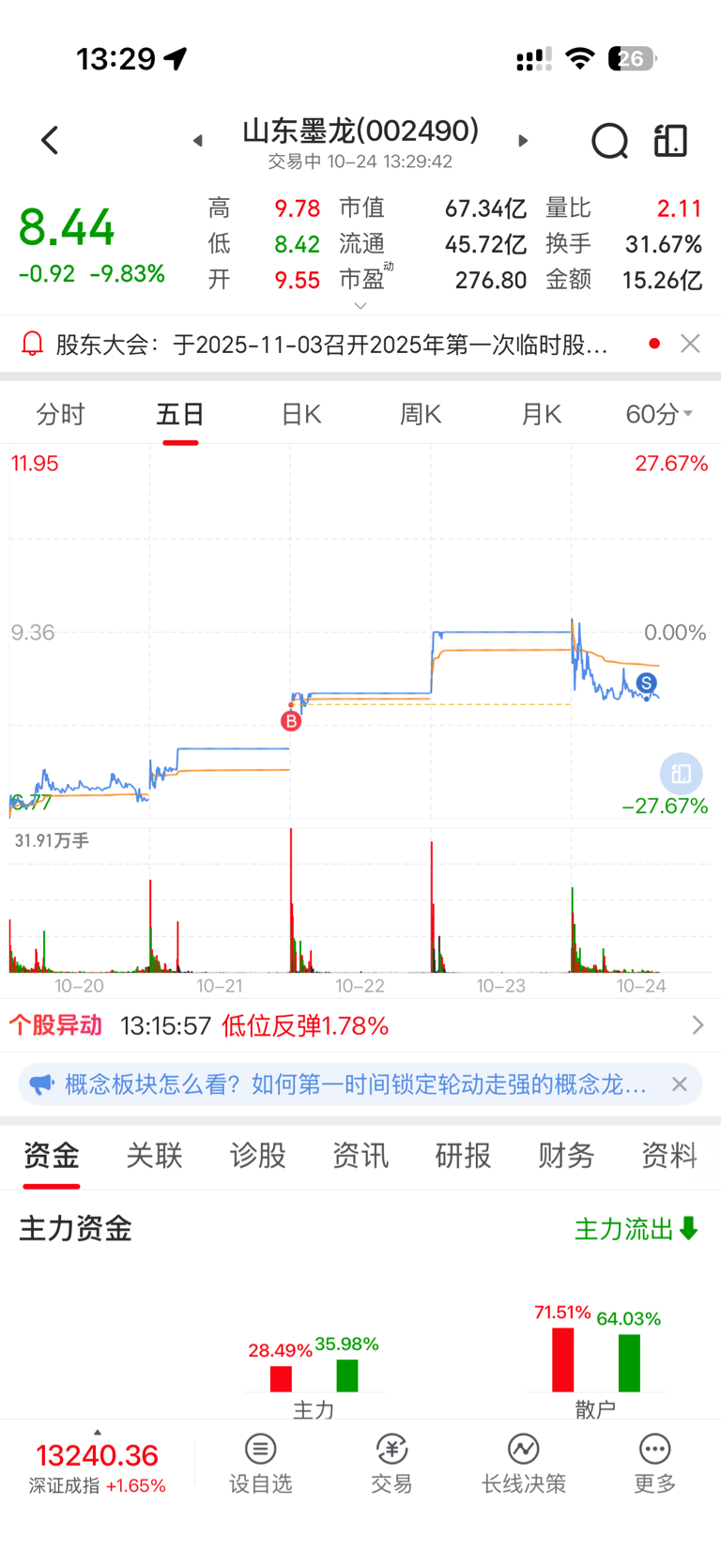 $山东墨龙(SZ002490)$ 山东墨龙一日游,前天买,今天买,啥也没赚