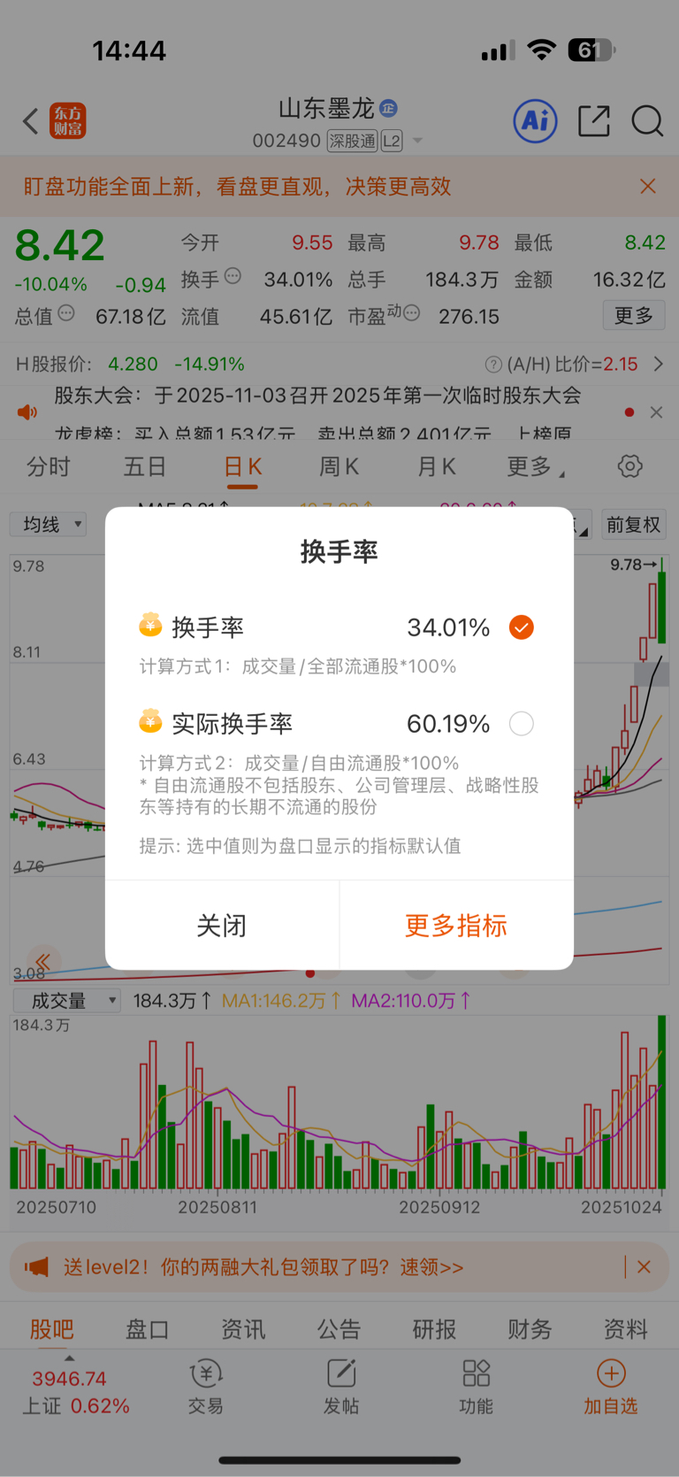 $山东墨龙(SZ002490)$ 请教:实际换手率60%多,不是应该用45.61亿*60%吗,成交金额怎么不对