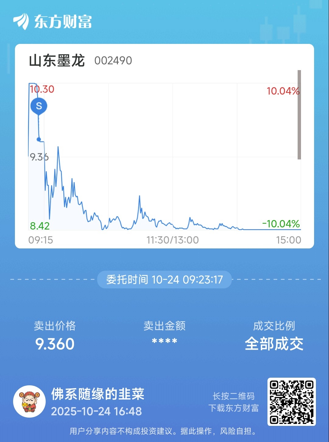 $山东墨龙(SZ002490)$ 竞价挂跌停逃跑,躲过12%的下跌