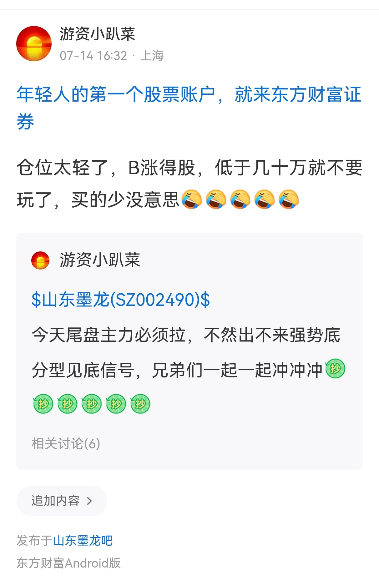 温馨提示: 1.根据《证券法》规定,禁止编造、传播虚假信息或者误导性信息,扰乱证券市场;2.用户在本社区发表的所有资料、言论等仅代表个人观点,与本网站立场无关,不对您构成任何投资建议。用户应基于自己的独立判断,自行决定证券投资并承担相应风险。《东方财富社区管理规定》