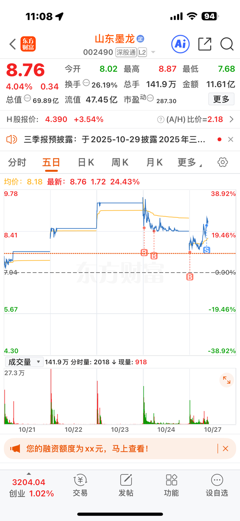 $山东墨龙(SZ002490)$ -9加仓进来的,做了大T,今天吃大肉咯