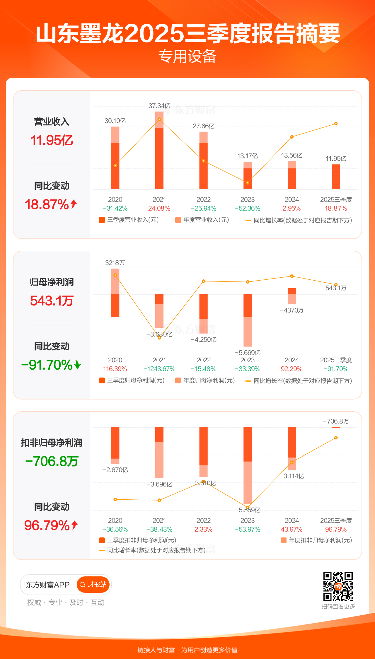 山东墨龙10月29日发布2025年三季报显示,公司前三季实现营业收入11.95亿元,同比增长18.87%;归母净利润543.10万元,同比下滑91.70%;扣非归母净利润-706.77万元。