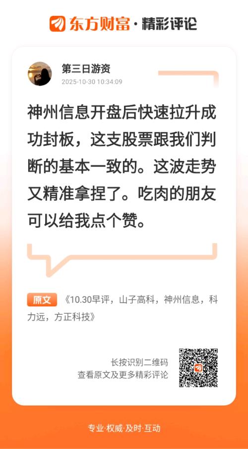 //@第三日游资 :神州信息开盘后快速拉升成功封板,这支股票跟我们判断的基本一致的。这波走势又精准拿捏了。吃肉的朋友可以给我点个赞。 $山东墨龙(SZ002490)$$安泰科技(SZ000969)$$平潭发展(SZ000592)$