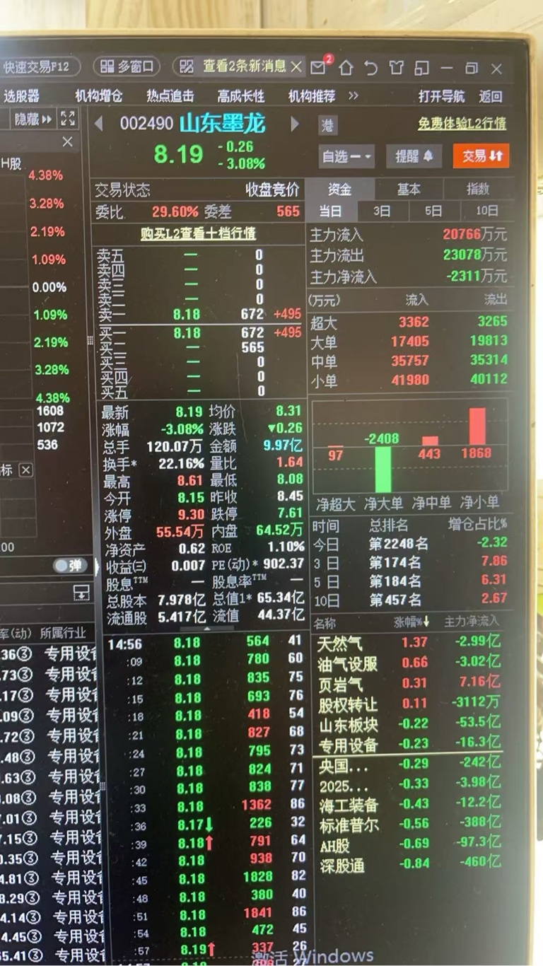 $山东墨龙(SZ002490)$ 墨龙最高拉升到8.61在拉萨帮疯狂出货下,直接砸到水下!
