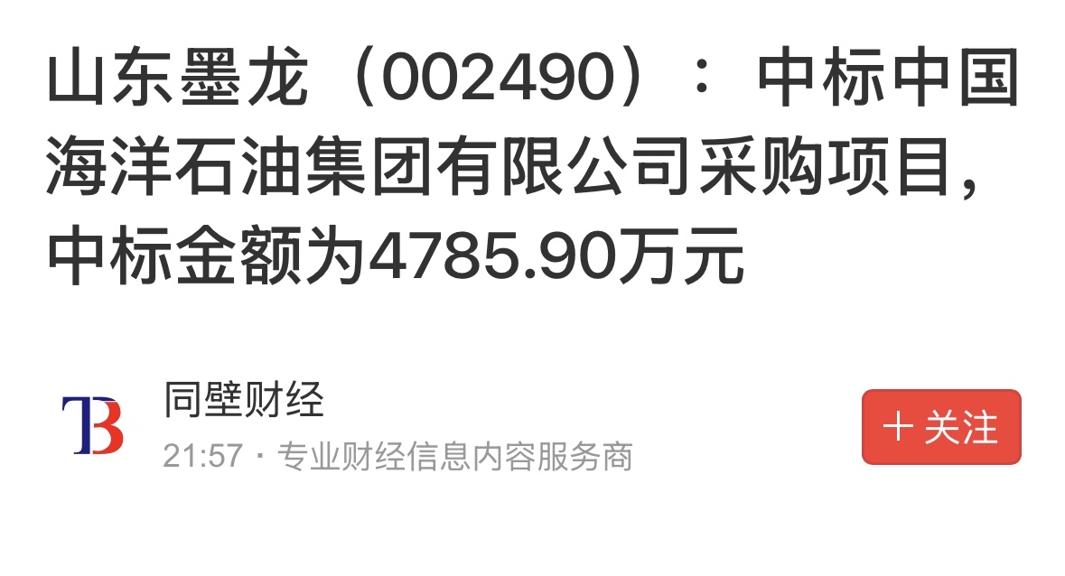 $山东墨龙(SZ002490)$ 山东墨龙石油机械股份有限公司于2026年1月14日公告中标中国海洋石油集团有限公司采购项目,中标金额为4785.90万元。