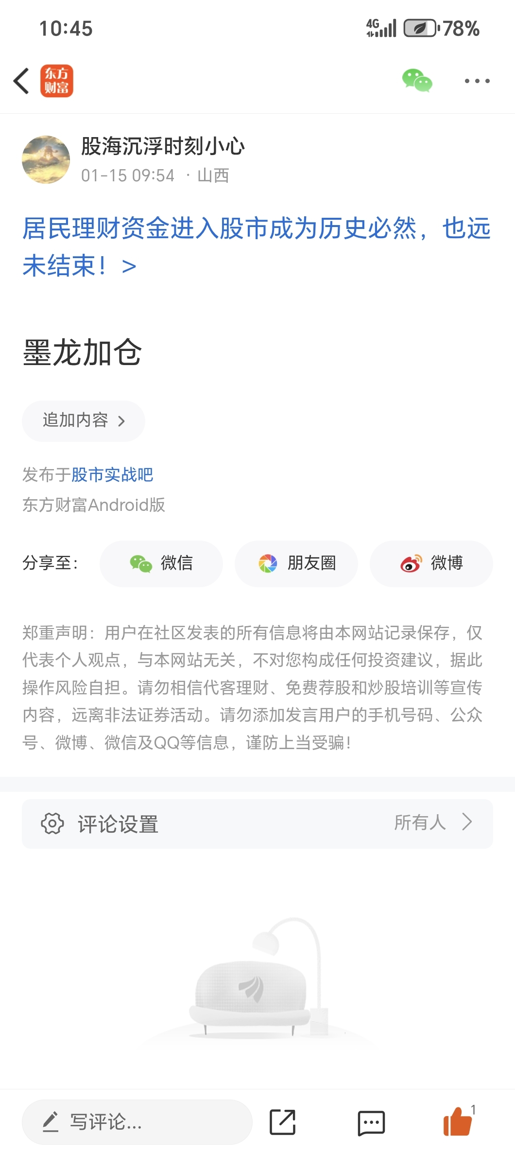 温馨提示: 1.根据《证券法》规定,禁止编造、传播虚假信息或者误导性信息,扰乱证券市场;2.用户在本社区发表的所有资料、言论等仅代表个人观点,与本网站立场无关,不对您构成任何投资建议。用户应基于自己的独立判断,自行决定证券投资并承担相应风险。《东方财富社区管理规定》