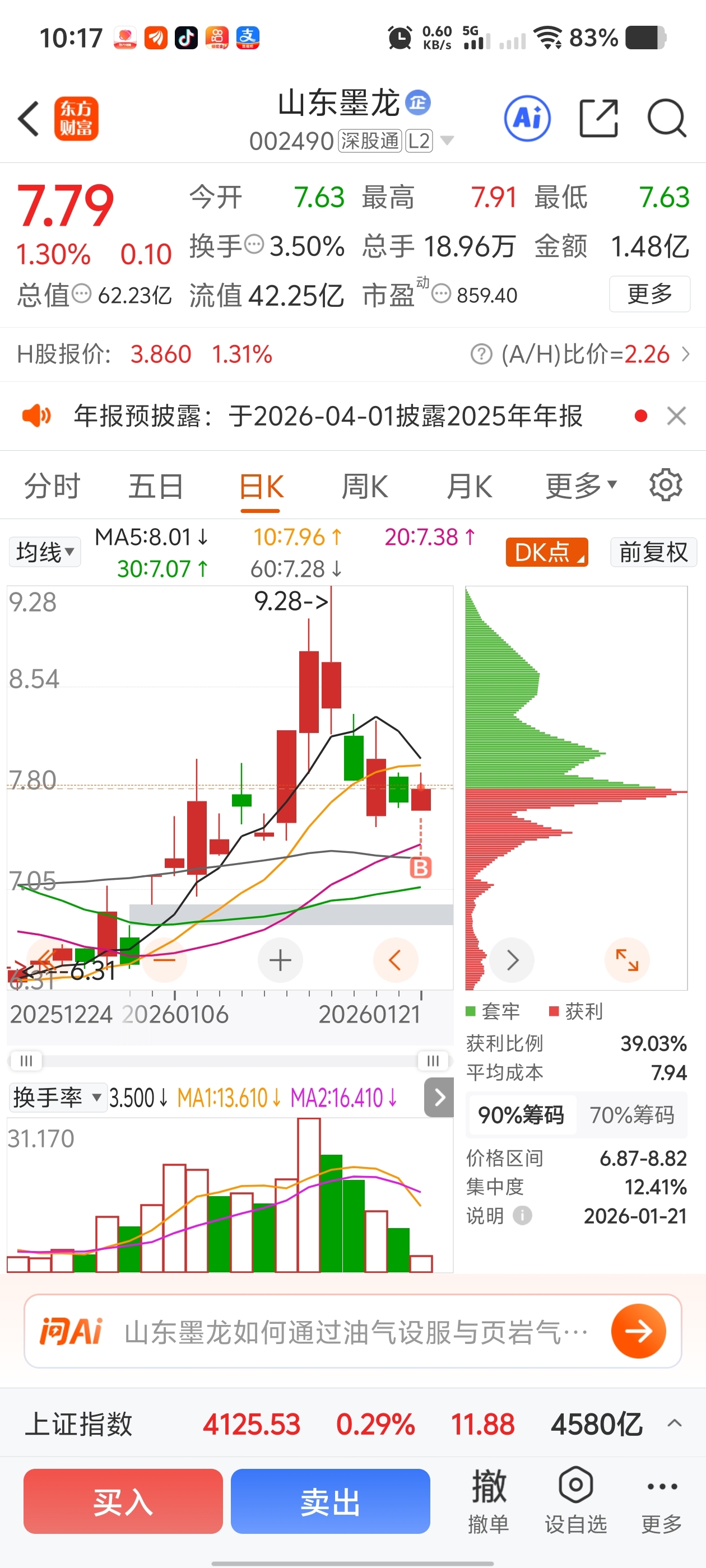 还可以测试了上面的压力位,还有下面的压力位,这个没有什么好说的了,看明天是回探下面的压力还是选择突破上面的压力位,这个时候很重要突破上面压力可能会直接碰板,但如果要去碰下面的,一旦破了,就是回调,所以这个也没什么好说的这个位置很简单,明天是走还是留直接看强弱就好了。$山东墨龙(SZ002490)$ #收盘点评# #炒股日记#