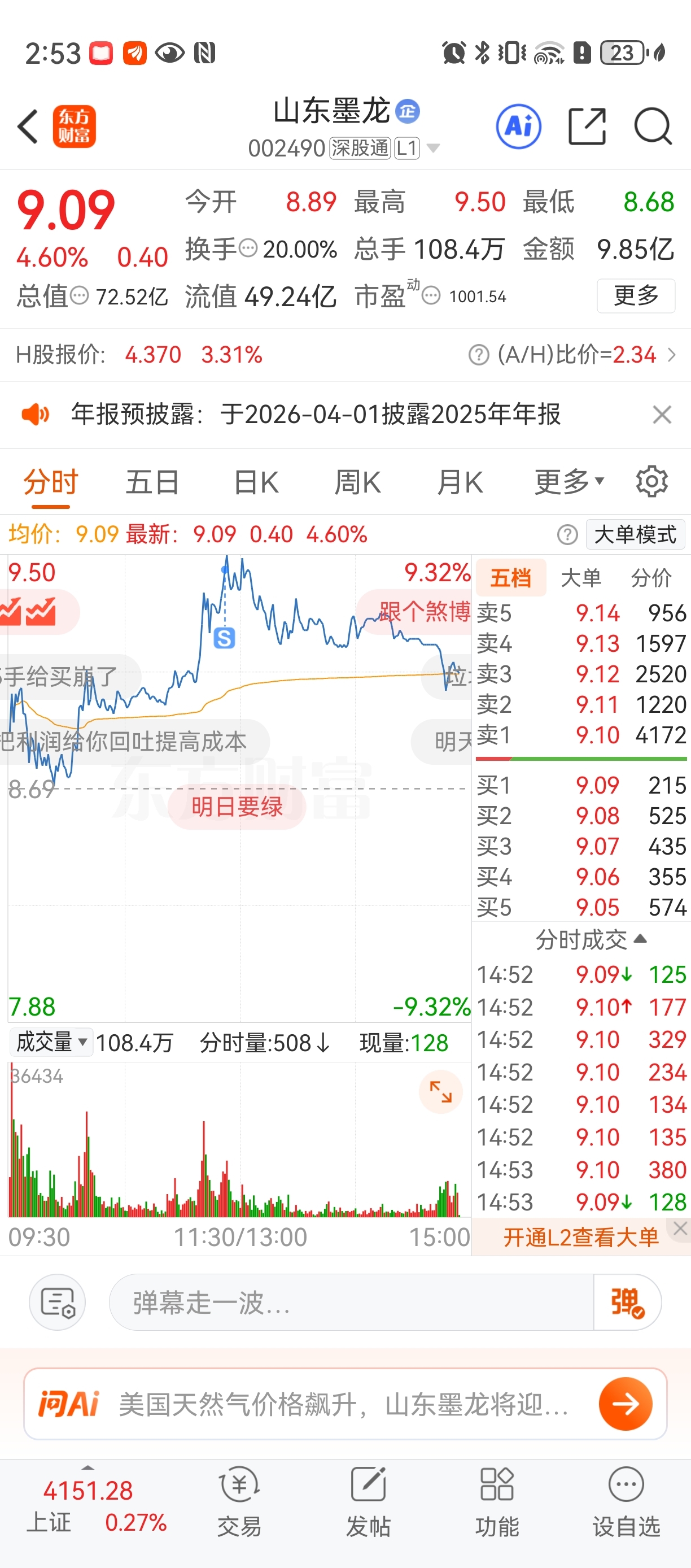 $山东墨龙(SZ002490)$ 可能有个原因是墨龙这种票今日明显掉队的原因,因为墨龙前面炒作属游资票而非机构票。早上如果盯盘很容易发现无非就是板块前排冲高,吸引墨龙量化脉冲罢了,没什么竞争力,整个均线特征也不强,别抱太大期待。早上跟你们说过了转战通源。