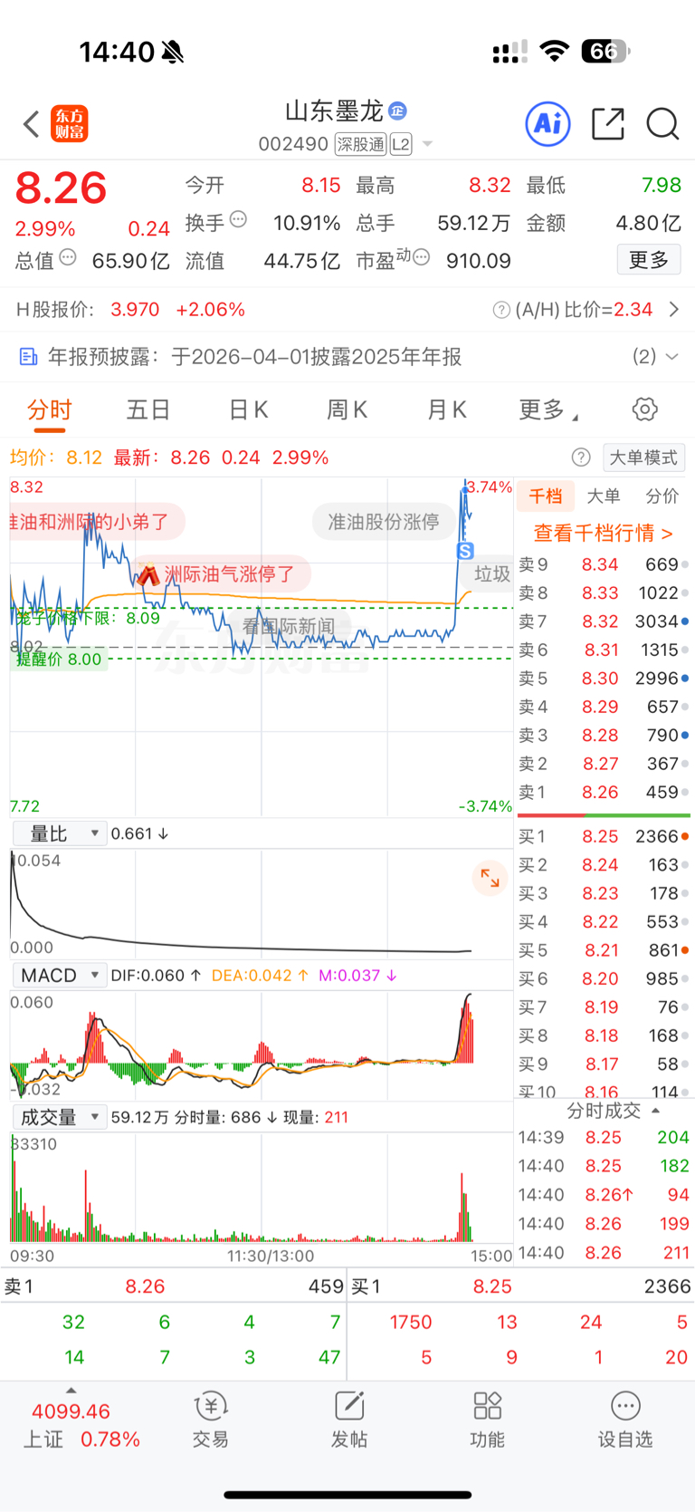 $山东墨龙(SZ002490)$ 先走一部分 低开再加仓 害怕了