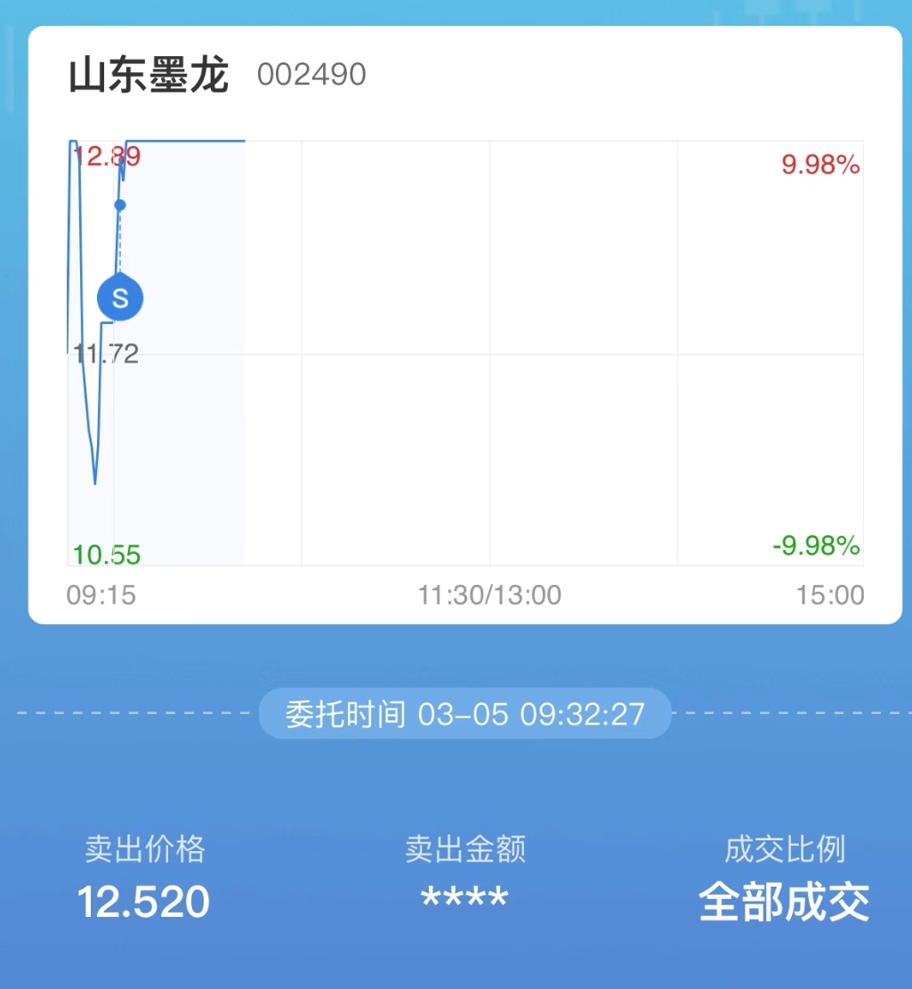 $山东墨龙(SZ002490)$ 昨天开盘炸了,7个点冲进来,今天7个点又冲出去