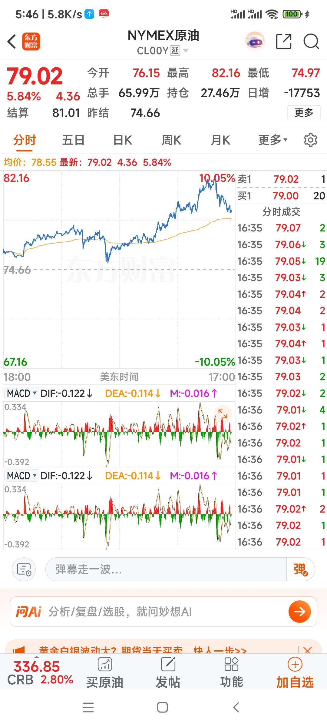WTI原油期货涨幅扩大至7%报79.898美元/桶东方财富Choice数据5小时