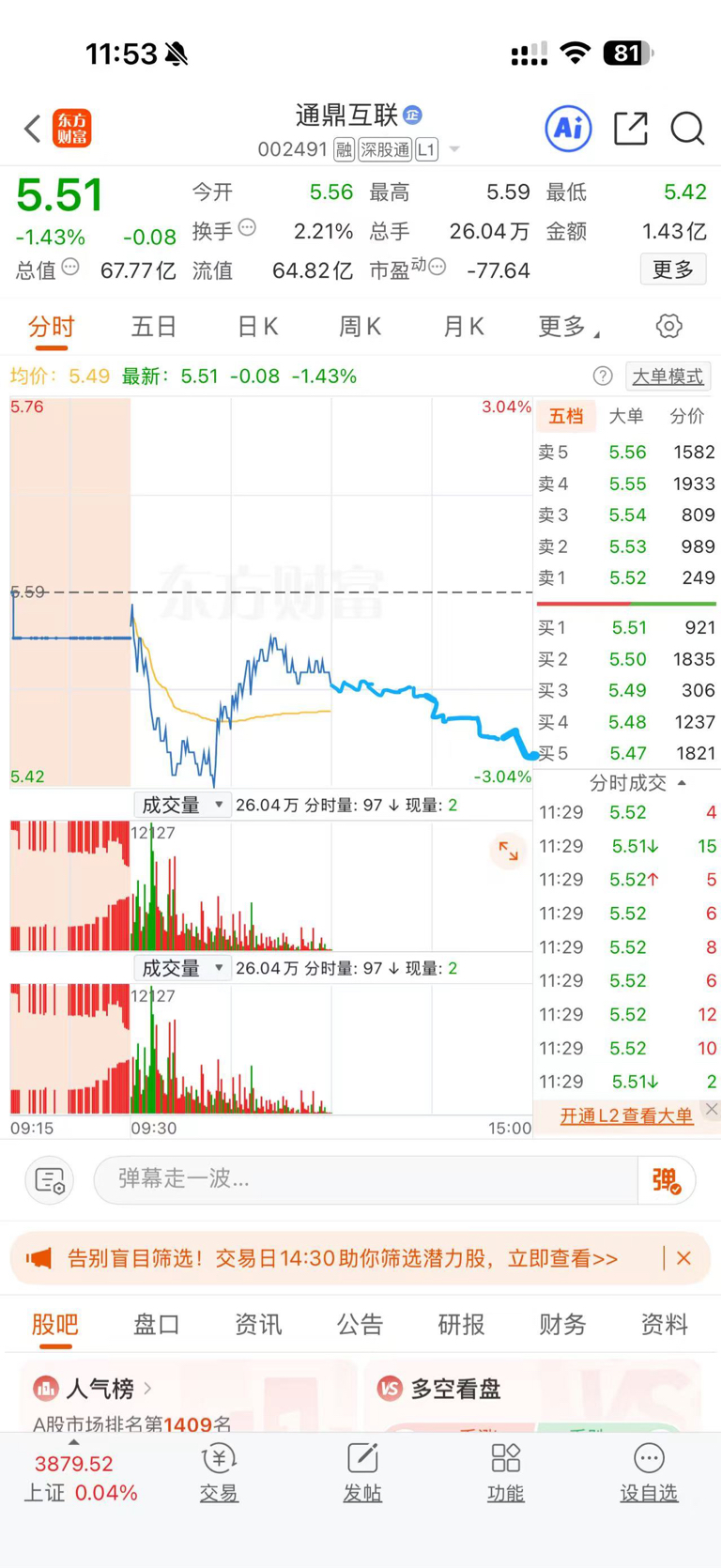 $通鼎互联(SZ002491)$ 以我对他股性的了解,预估下下午走势