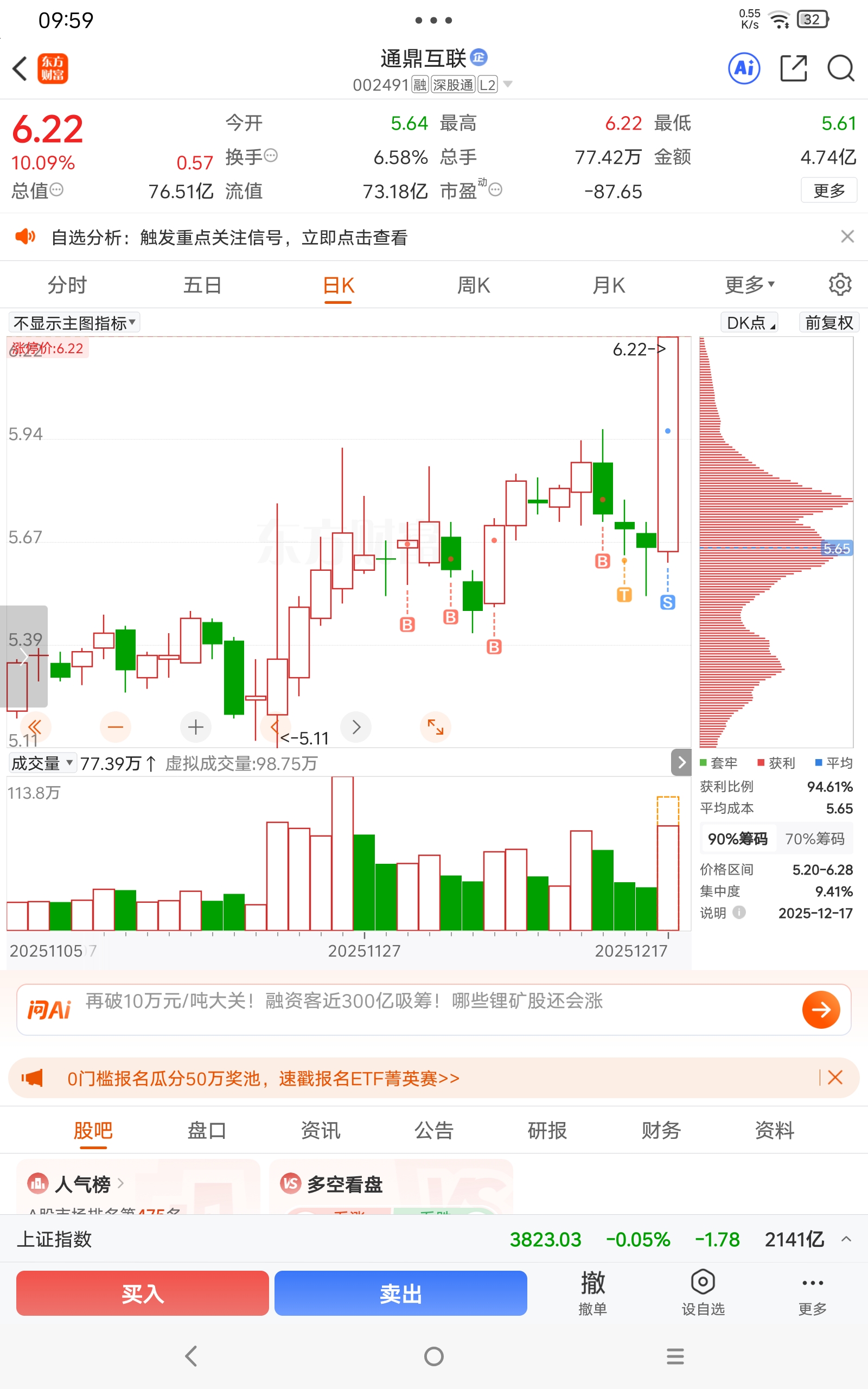 $通鼎互联(SZ002491)$ 不懂炒,卖飞了