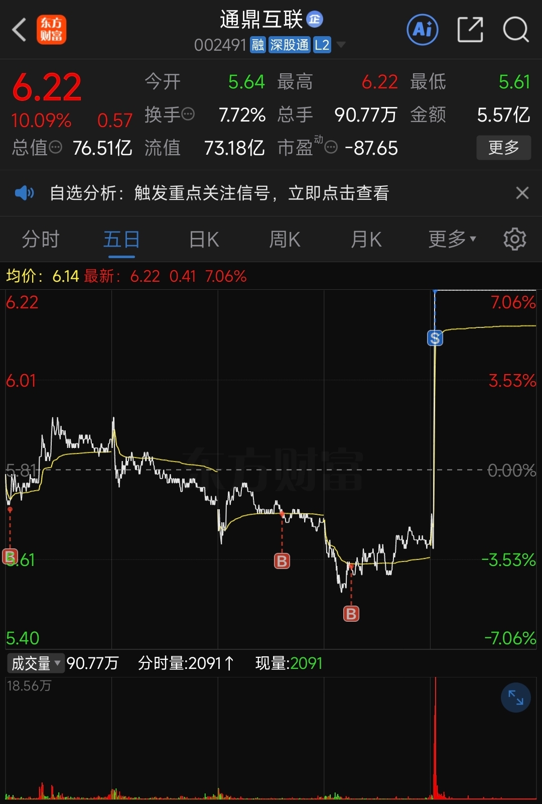 $通鼎互联(SZ002491)$ 板上卖了,幻想连板的别做梦了!这庄阴的狠,只能见好就收!今天不跑的明天拍大腿了!