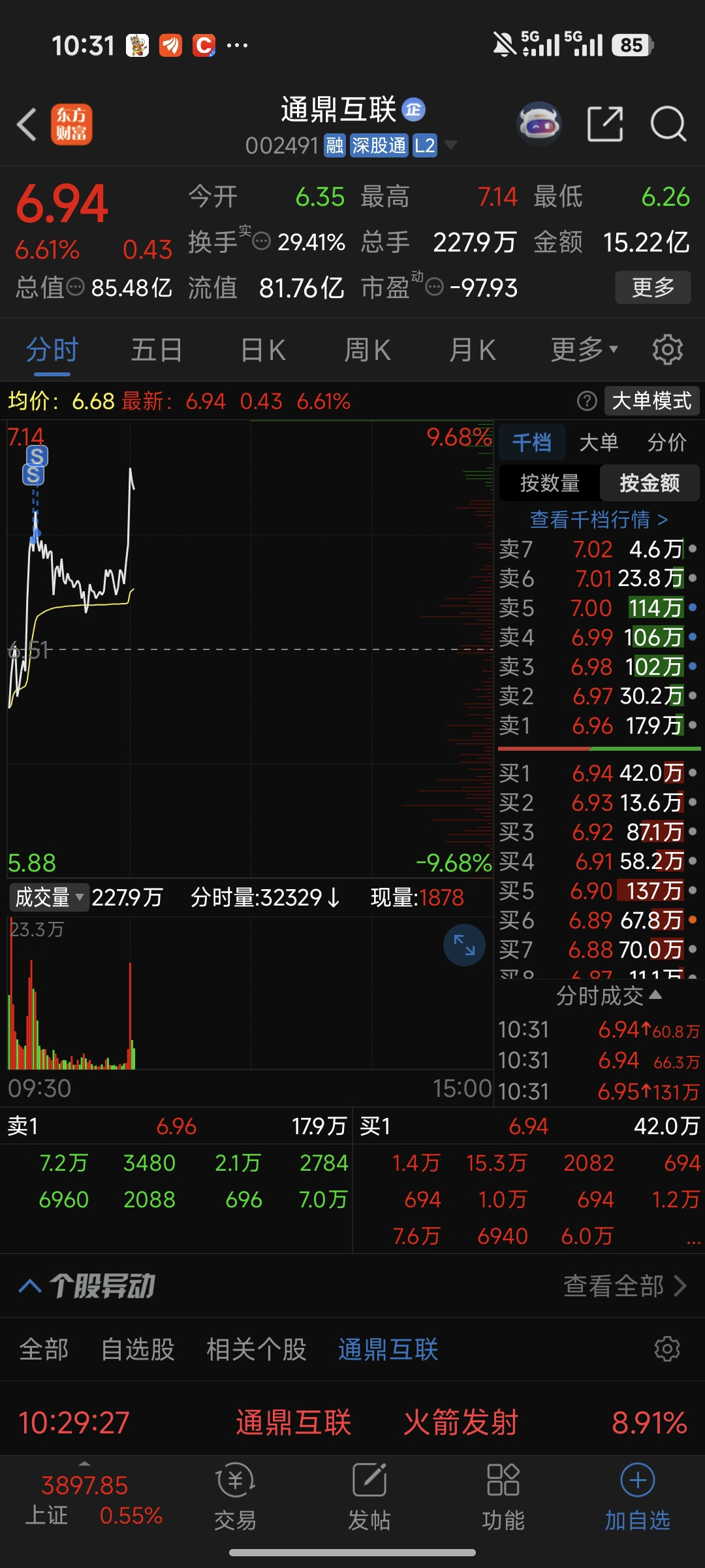 $通鼎互联(SZ002491)$ 走了走了!祝各位发财!五个点利润就行了!