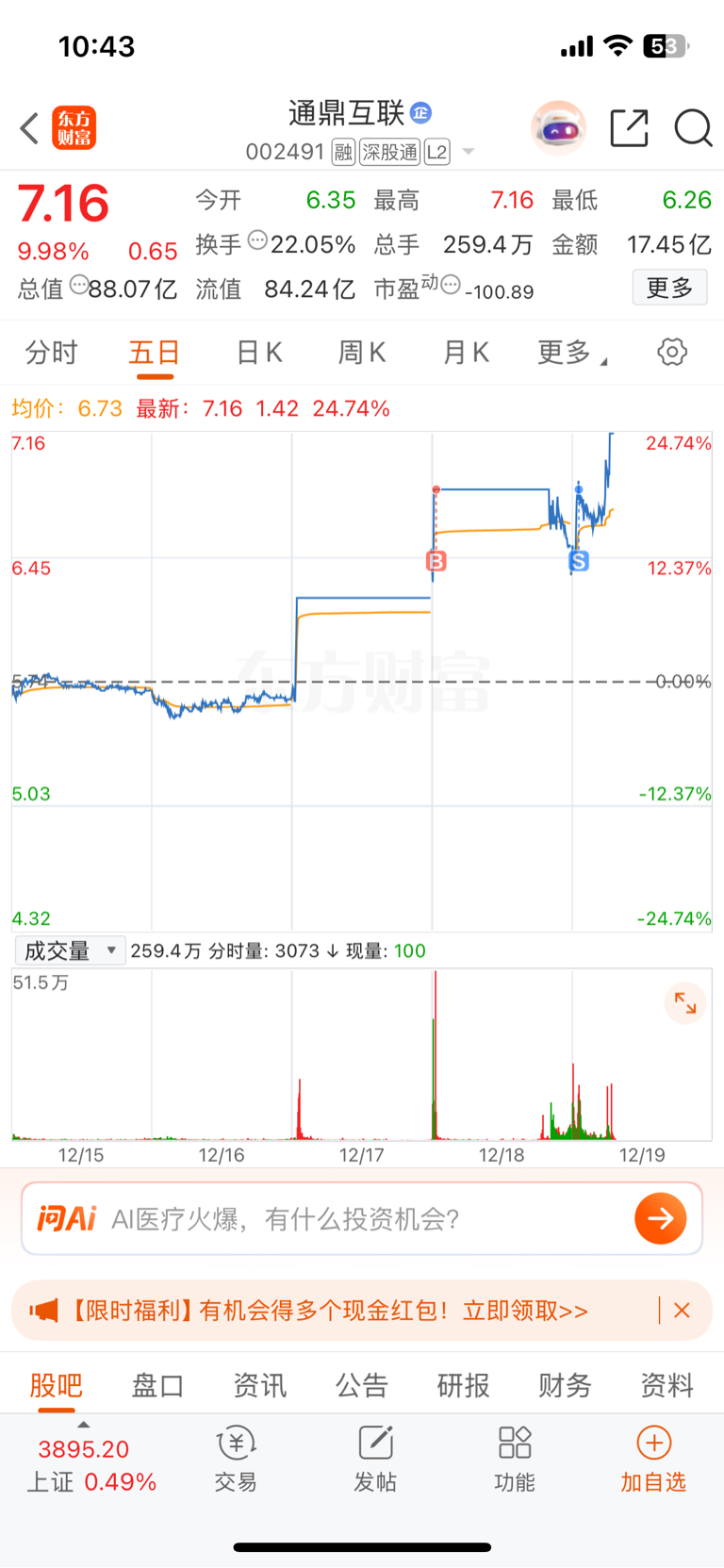$通鼎互联(SZ002491)$ 昨天板上进,今天平盘出,也不后悔了