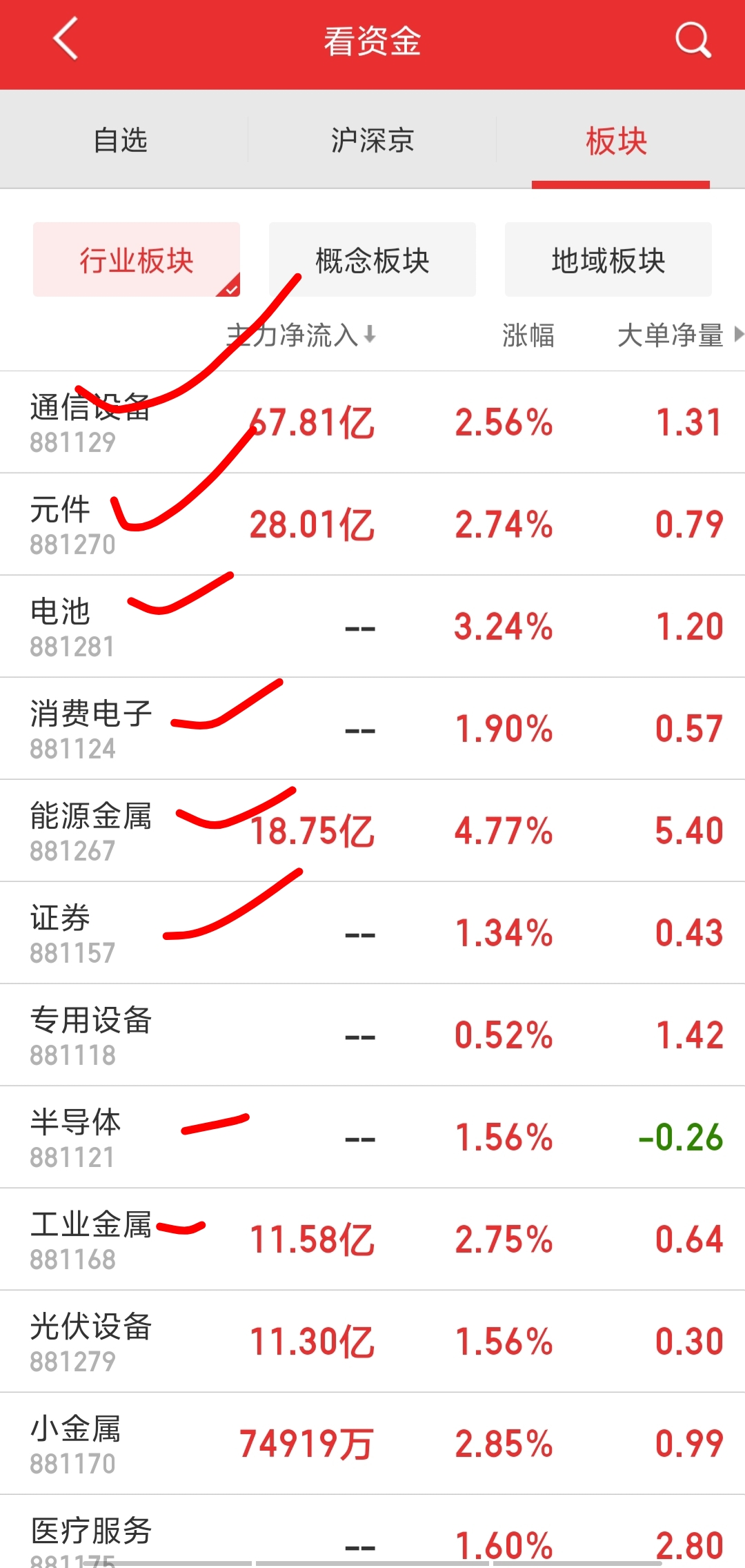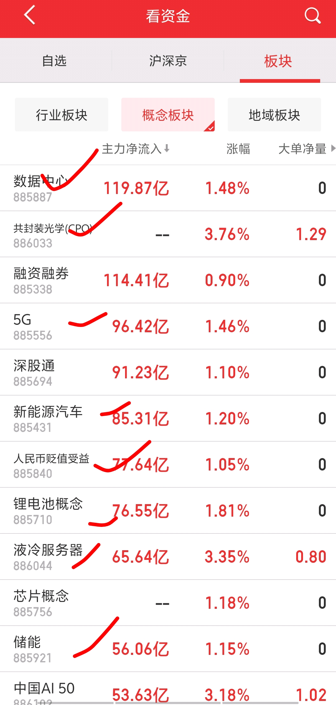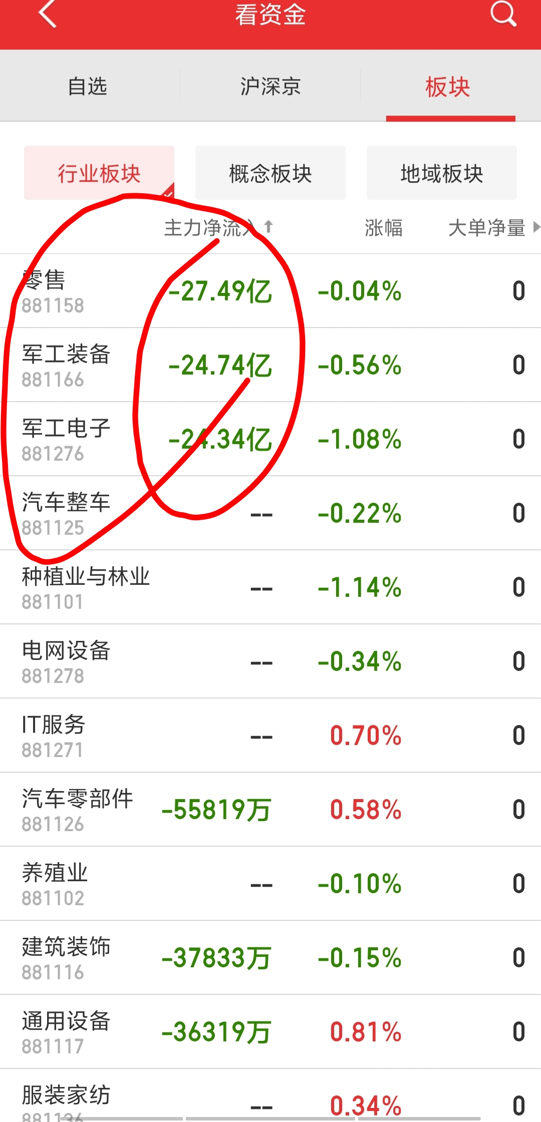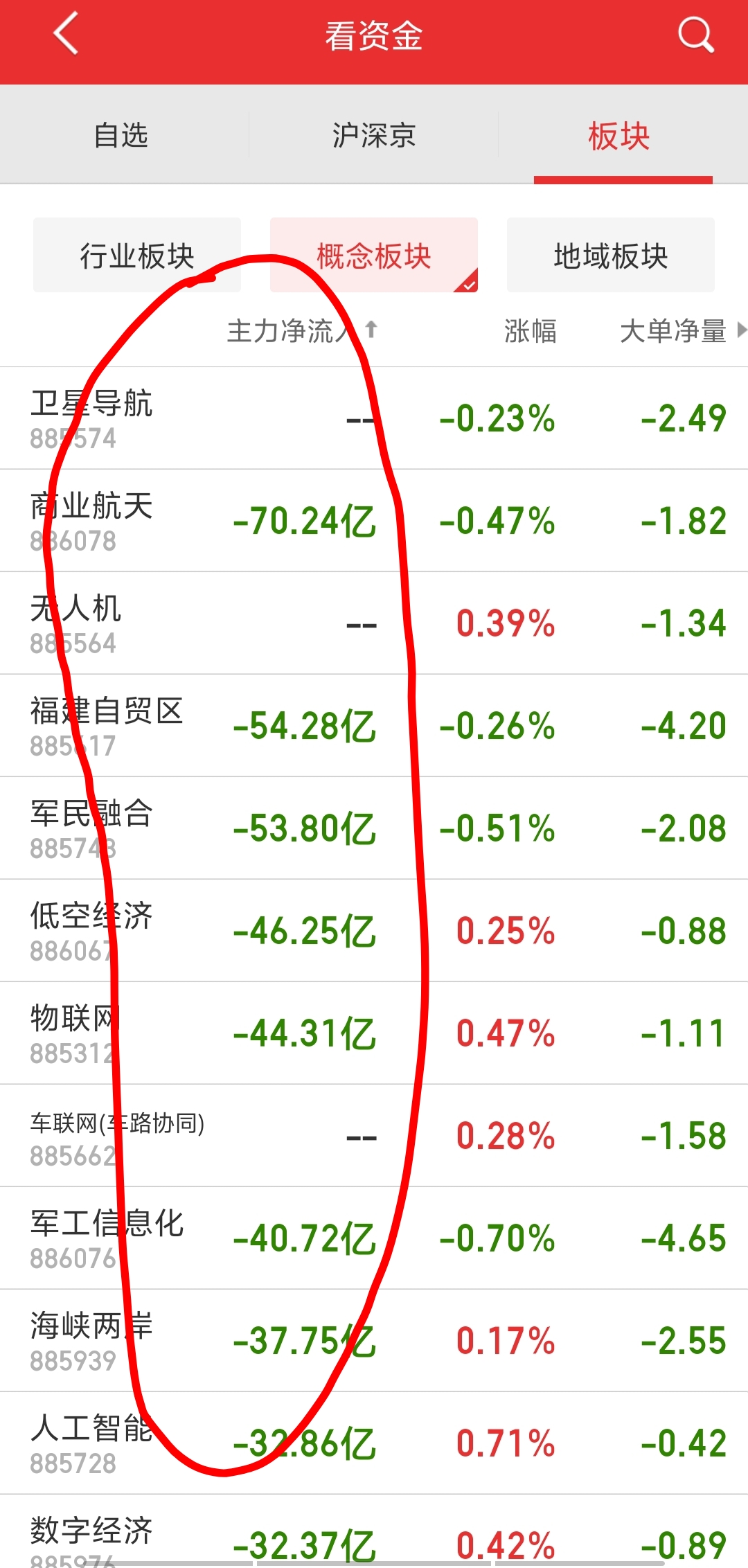 今日主力进攻和撤退方向(净流入,净流出情况):