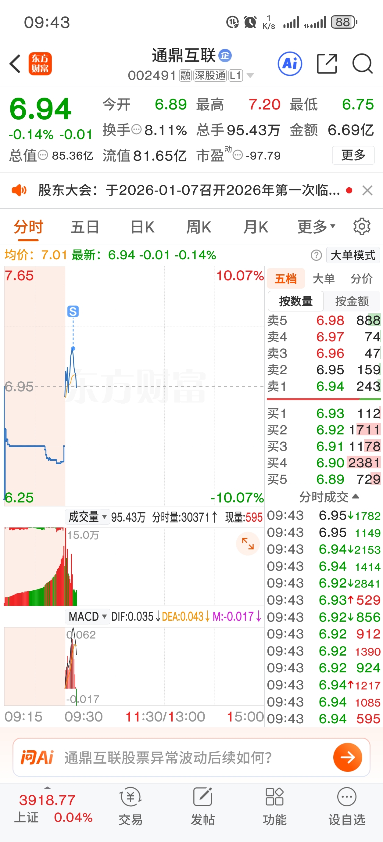 $通鼎互联(SZ002491)$ 748进717出少亏点算了