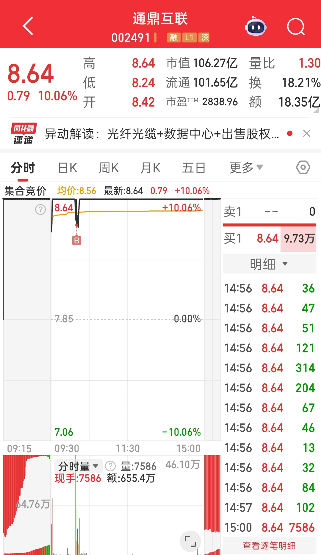 今日早盘介入了通鼎互联今天给了机会,龙哥毫不犹豫上车。上周介入的中超控股今天再次