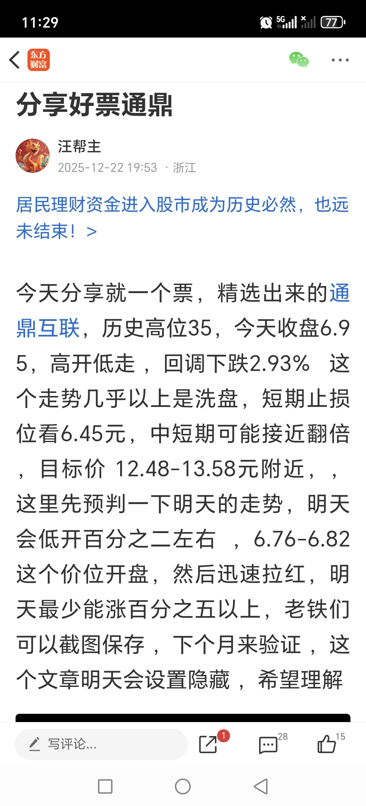 一个月前特别推荐,六块多的通鼎互联,还有人喷我,现在9.5是不是高攀不起,当时特
