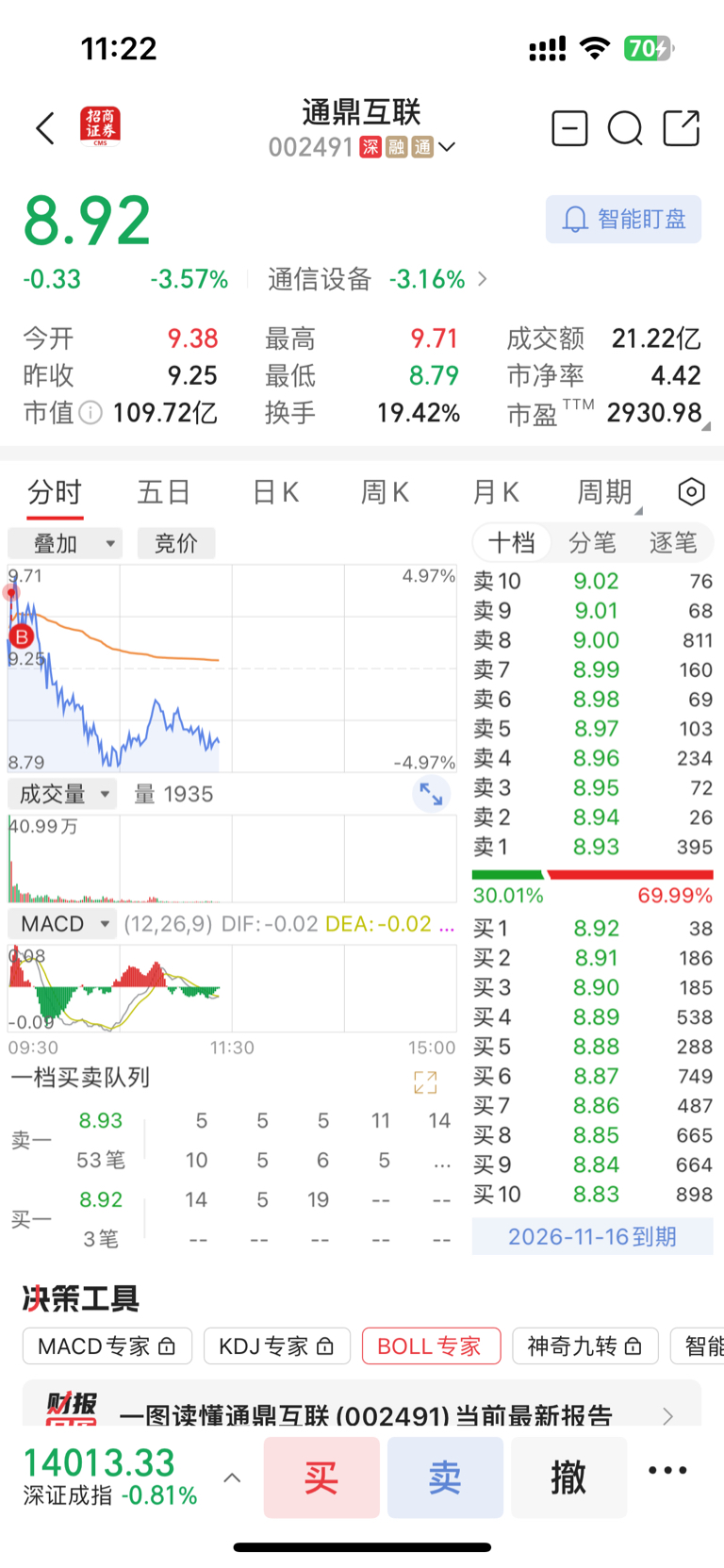$通鼎互联(SZ002491)$ 兄弟们多头变成空头,
