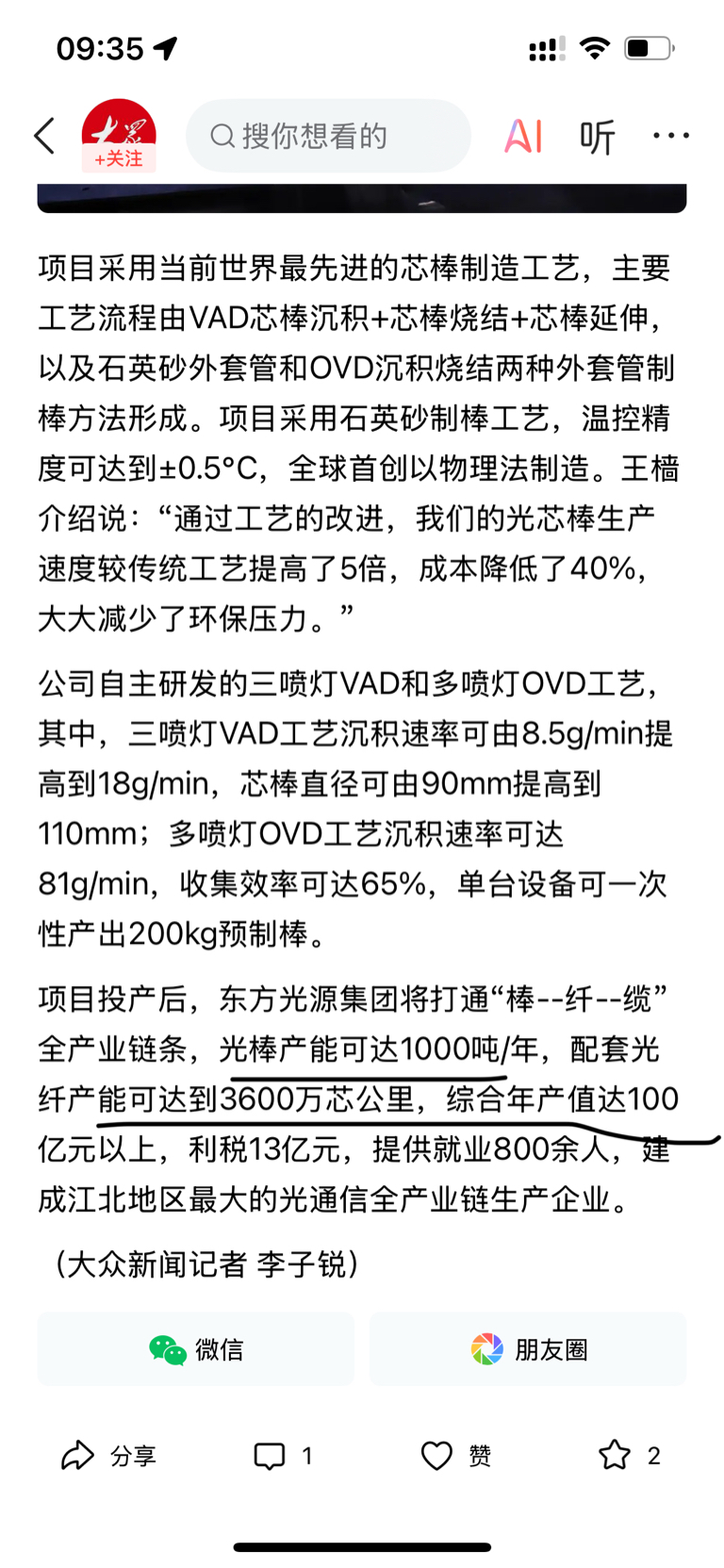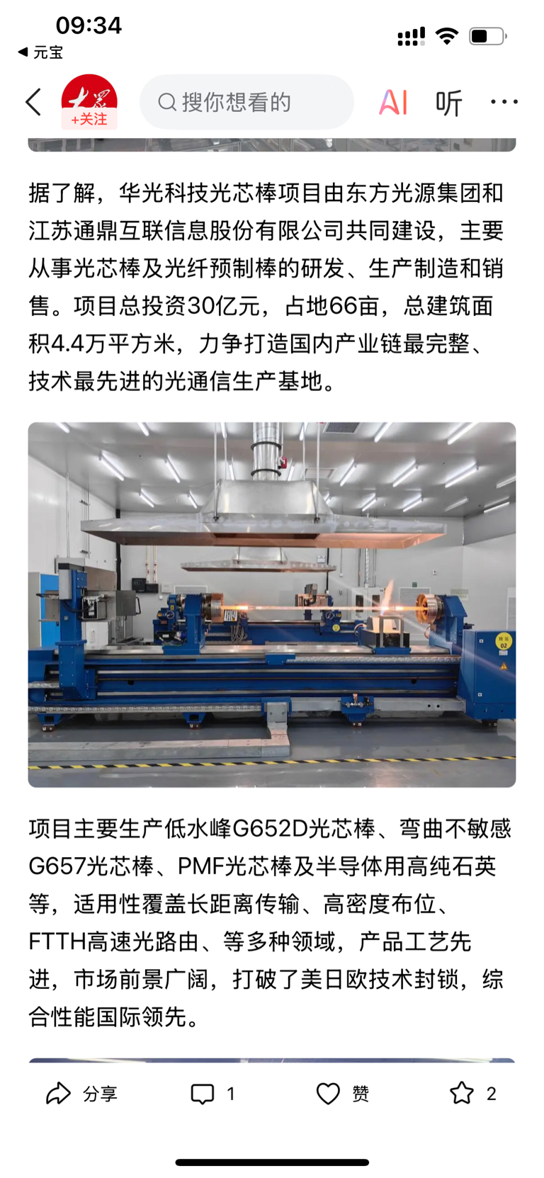 $通鼎互联(SZ002491)$ 山东华光新材料控股有限公司是通鼎互联占比49%股权的联营公司,年产1000吨的光棒项目2024年7月份已经开始点火试产,光棒产能扩张周期一般需要两年,厂房建设和设备安装需要6到12个月,最耗时间的是点火后的工艺调试和产能爬坡,需要6到12月,正好赶上了这一轮光纤大周期,联营公司不仅仅稳固通鼎光纤产业一体化竞争力,还能享受光纤大周期49%的收益红利。
