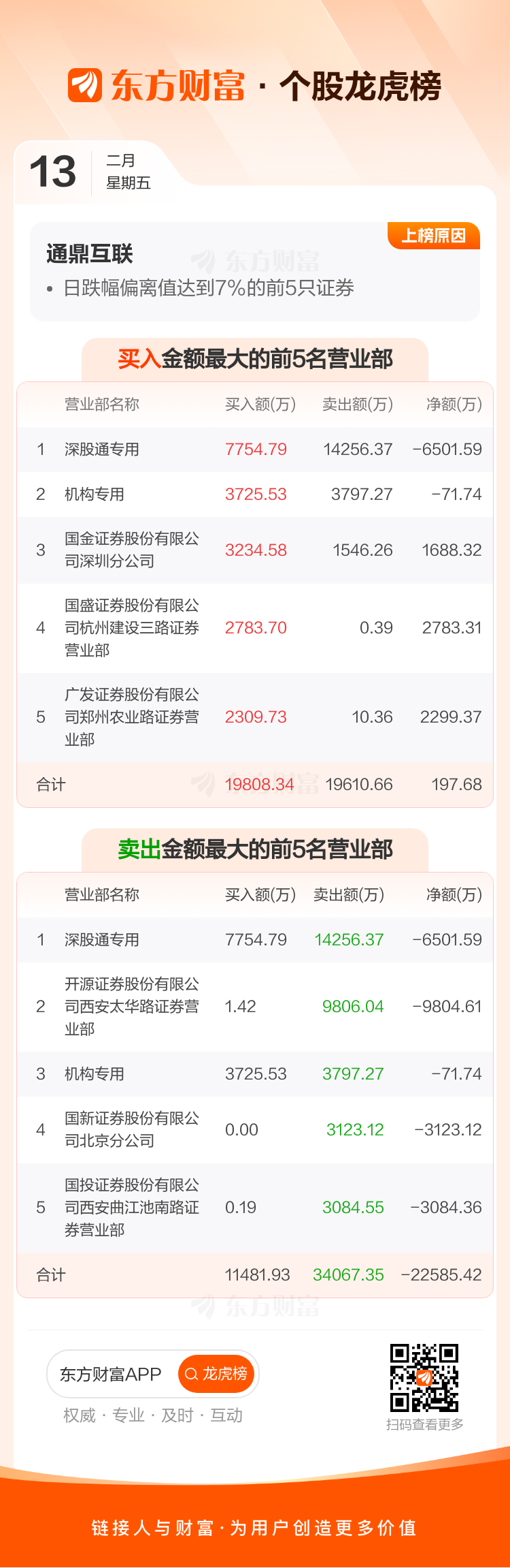 交易所2026年2月13日公布的交易公开信息显示,通鼎互联因成为日跌幅偏离值达到7%的前5只证券上榜。通鼎互联当日收报9.26元,涨跌幅-10.01%,偏离值-8.95%,换手率17.01%,成交额19.26亿。