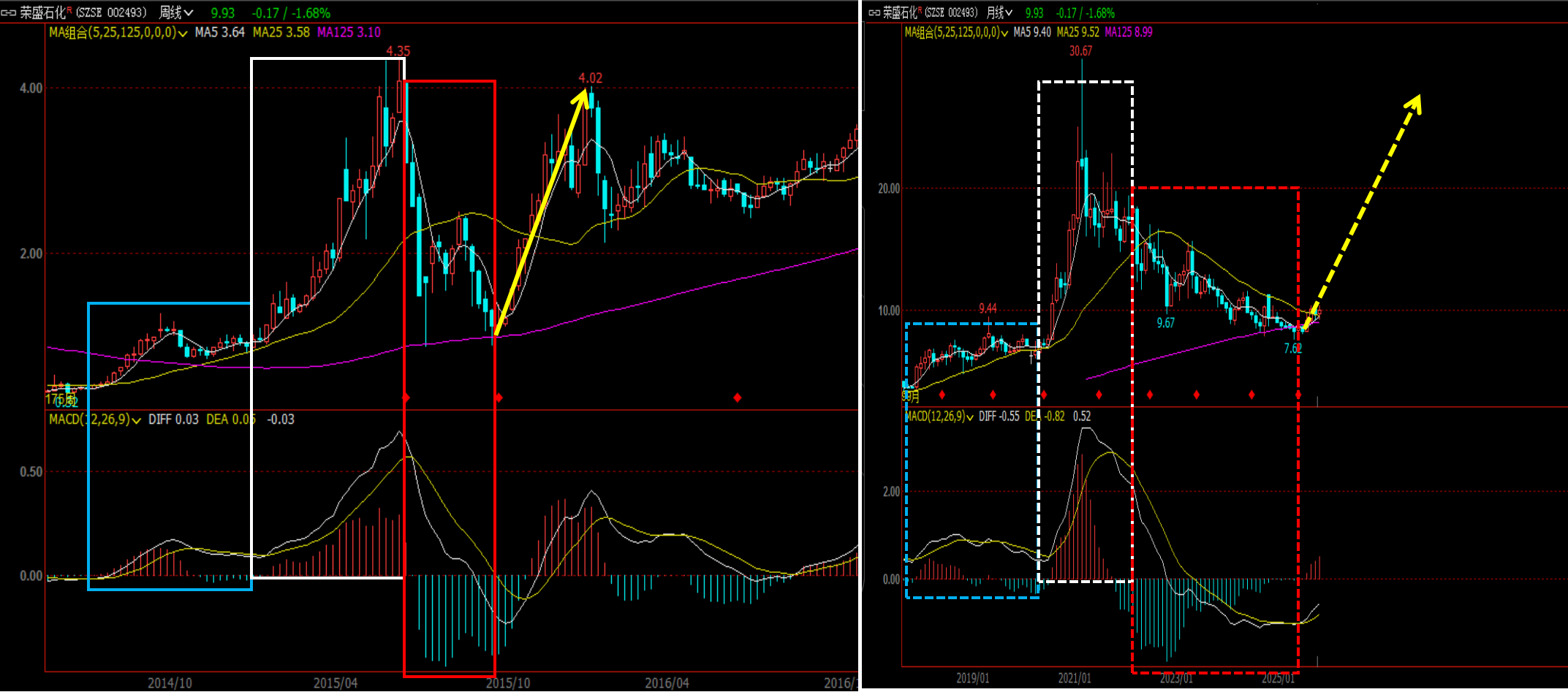 负债扩张,就是“别人恐惧的时候我贪婪”。原油探底到现在,很多人对于油价都开始悲观了。巴菲特此时买进石化业务相关的企业,就如同荣盛石化负债扩张一样。荣盛石化负债扩张,本身就是加杠杆,股票本身就有杠杠,所以,此刻10元以下建仓,一年左右的时间,通过黄色虚线箭头的同构上涨,荣盛石化最低也可以涨到30元以上。这也是为什么我会移情别恋,连三六零都抛弃放弃的原因。