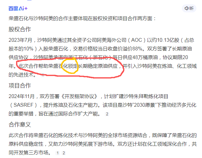 无意中发现沙特阿美与荣盛石化有合作。合作内容中,最最重要的就是我黄色圈圈标出的内容。锁定长期石油供应,也就是意味着目前的地板价原油价格被锁定了,一旦原油暴涨,荣盛石化就赚翻了!