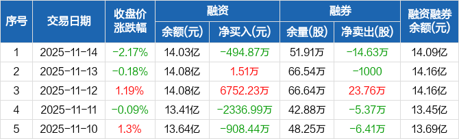 荣盛石化:融资净偿还494.87万元,融资余额14.03亿元(11-14)