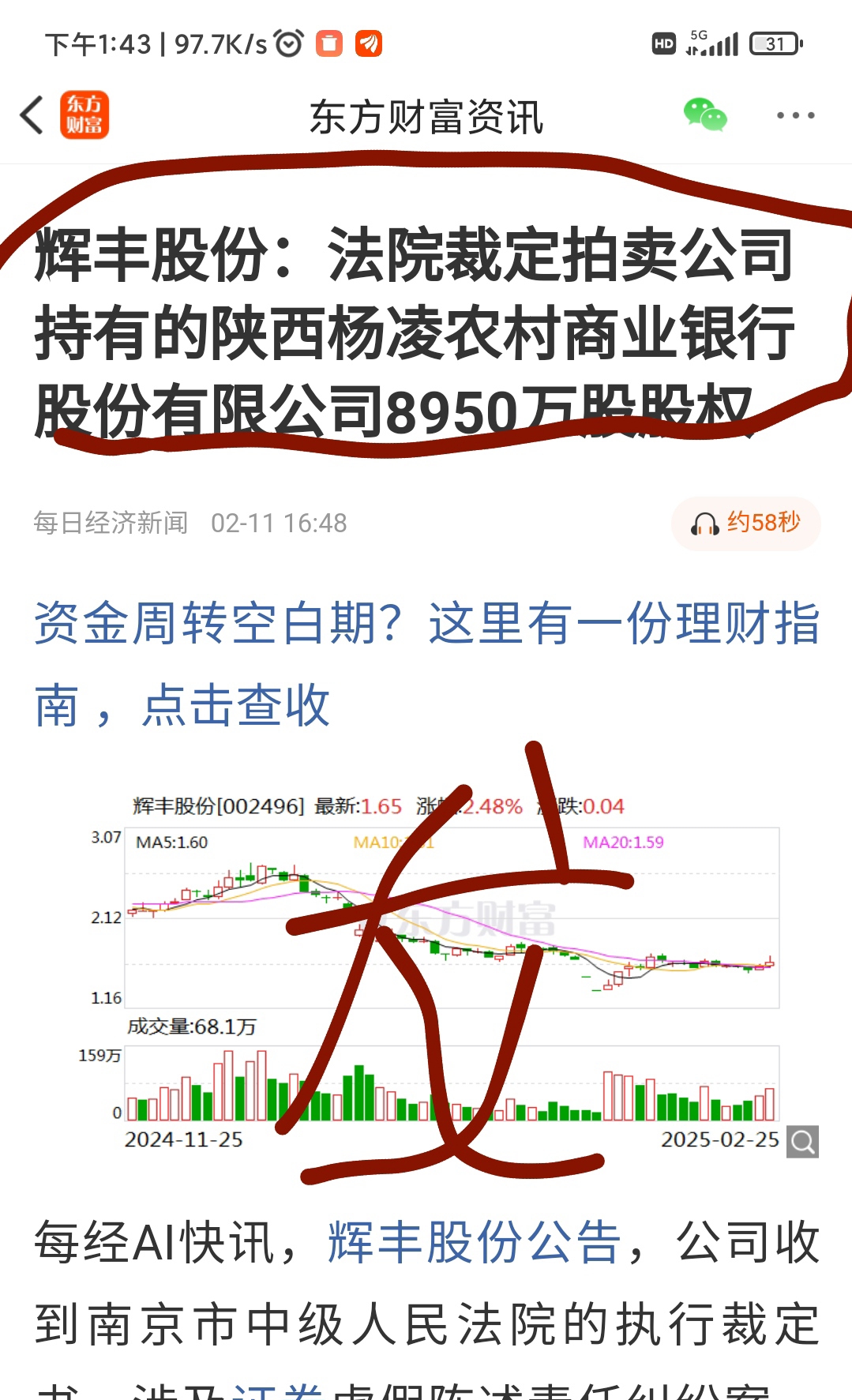 银行股股权拍卖营收超过6亿!无风险辉丰股份:法院裁定拍卖公司持有的陕西杨凌农村商