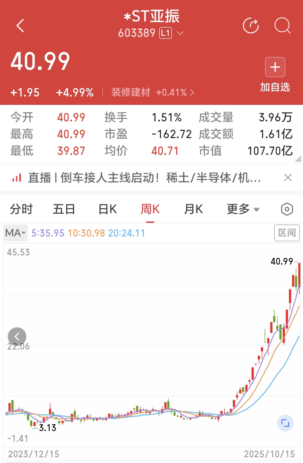 *ST亚振4月29日6元戴帽,目前股价40.99元。