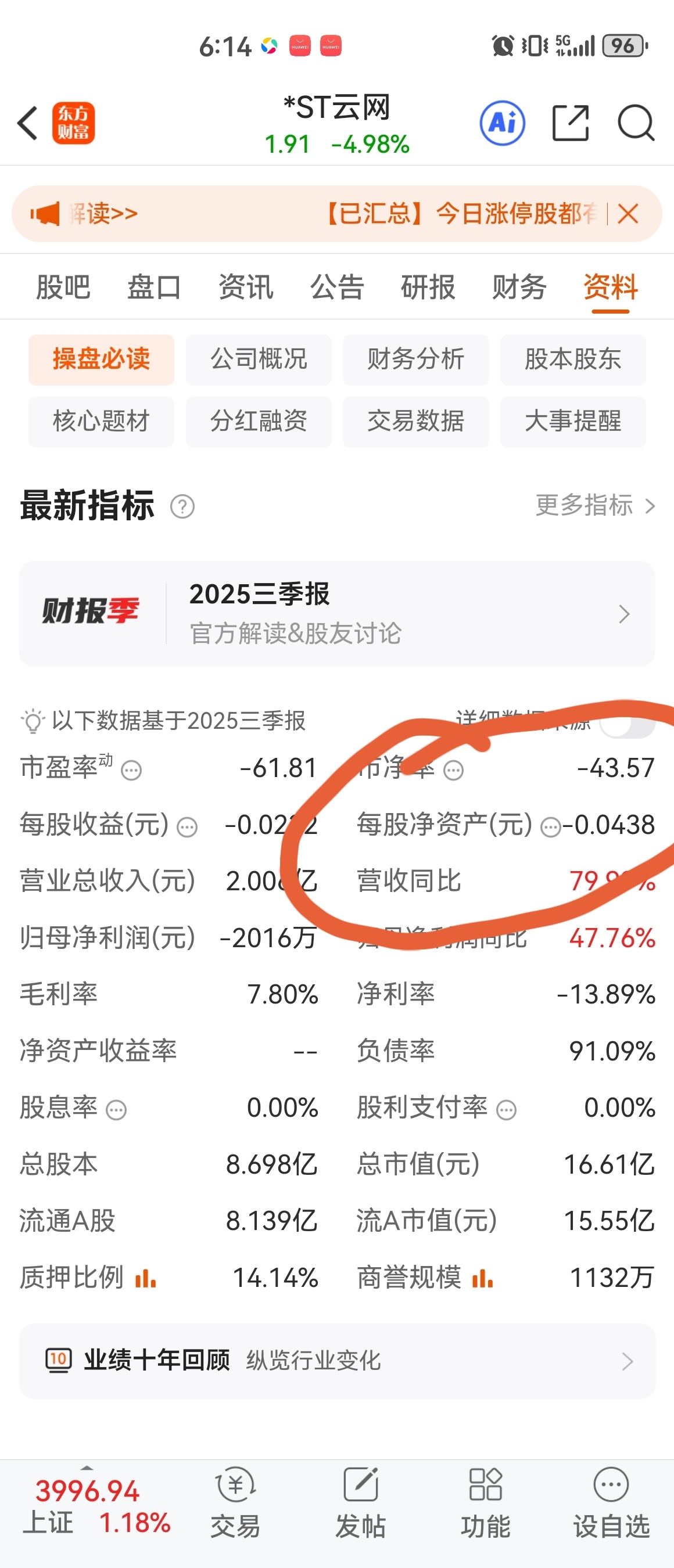 今天有人提了云网净资产为负,提了四环收盘2.48元和辉丰差不多的流通盘,辉丰要涨