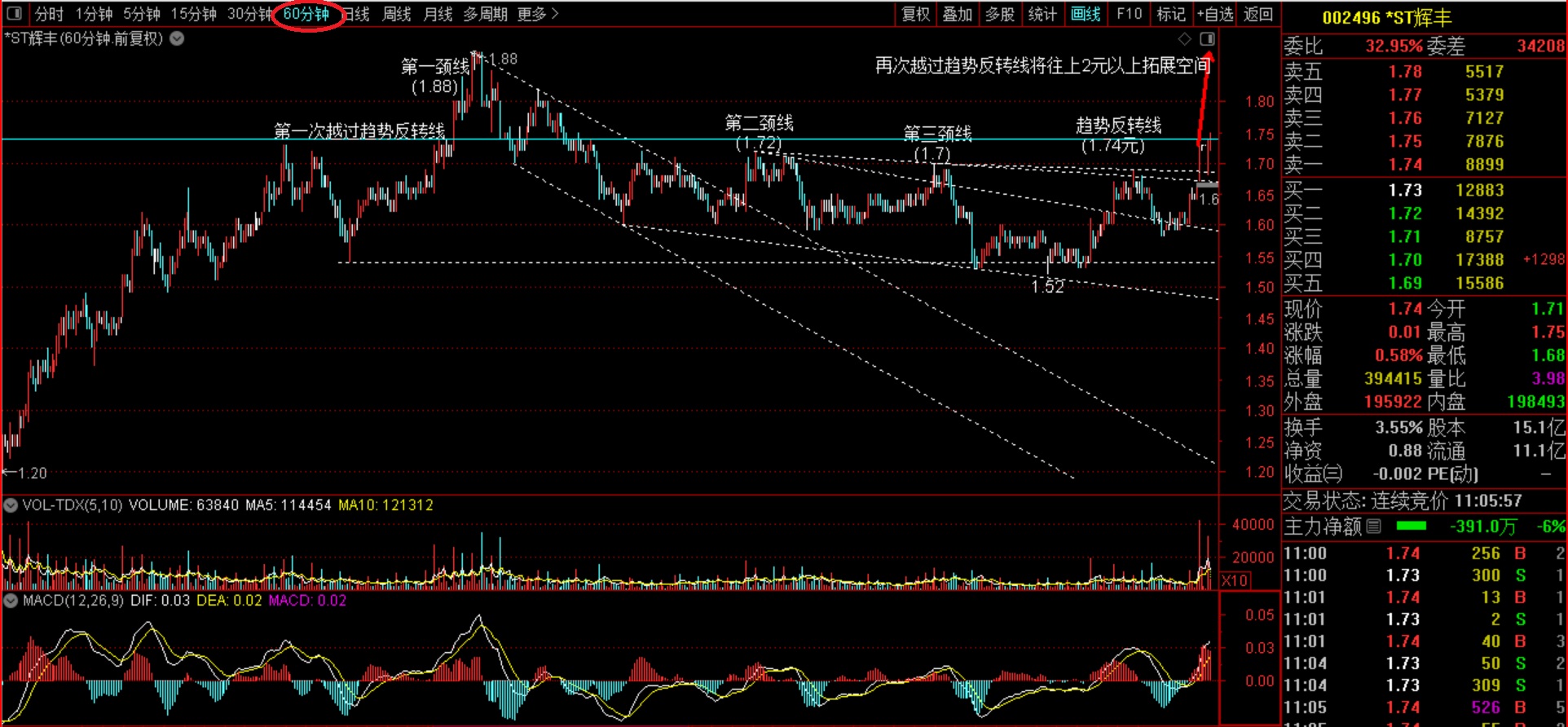 固化角度看问题-缺口要回补了(忙碌奔波缺心骨)——山重水复-柳暗花明(辉丰股份)——换个角度看问题-缺口不回补了(闲庭信步信心满)