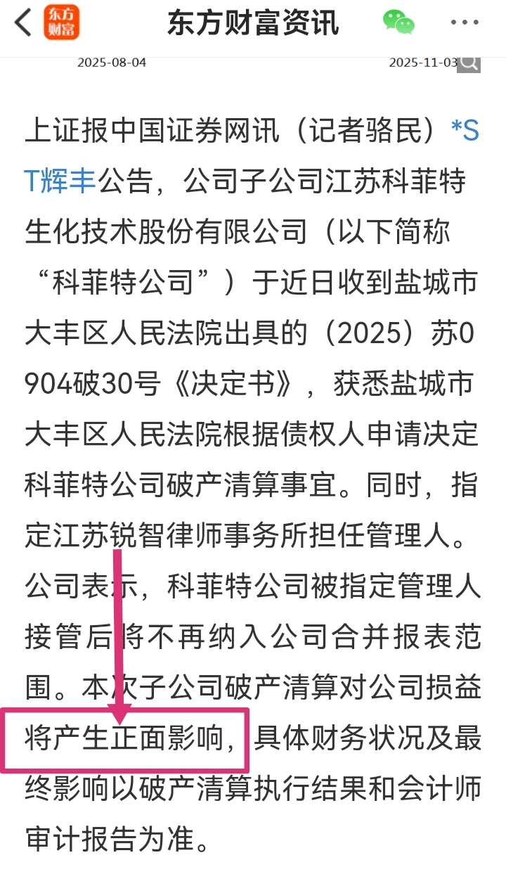 $*ST辉丰(SZ002496)$ 空头别叫,看好了,子公司清算会对公司产生正面影响!懂正面影响什么意思么?不懂就百度一下吧
