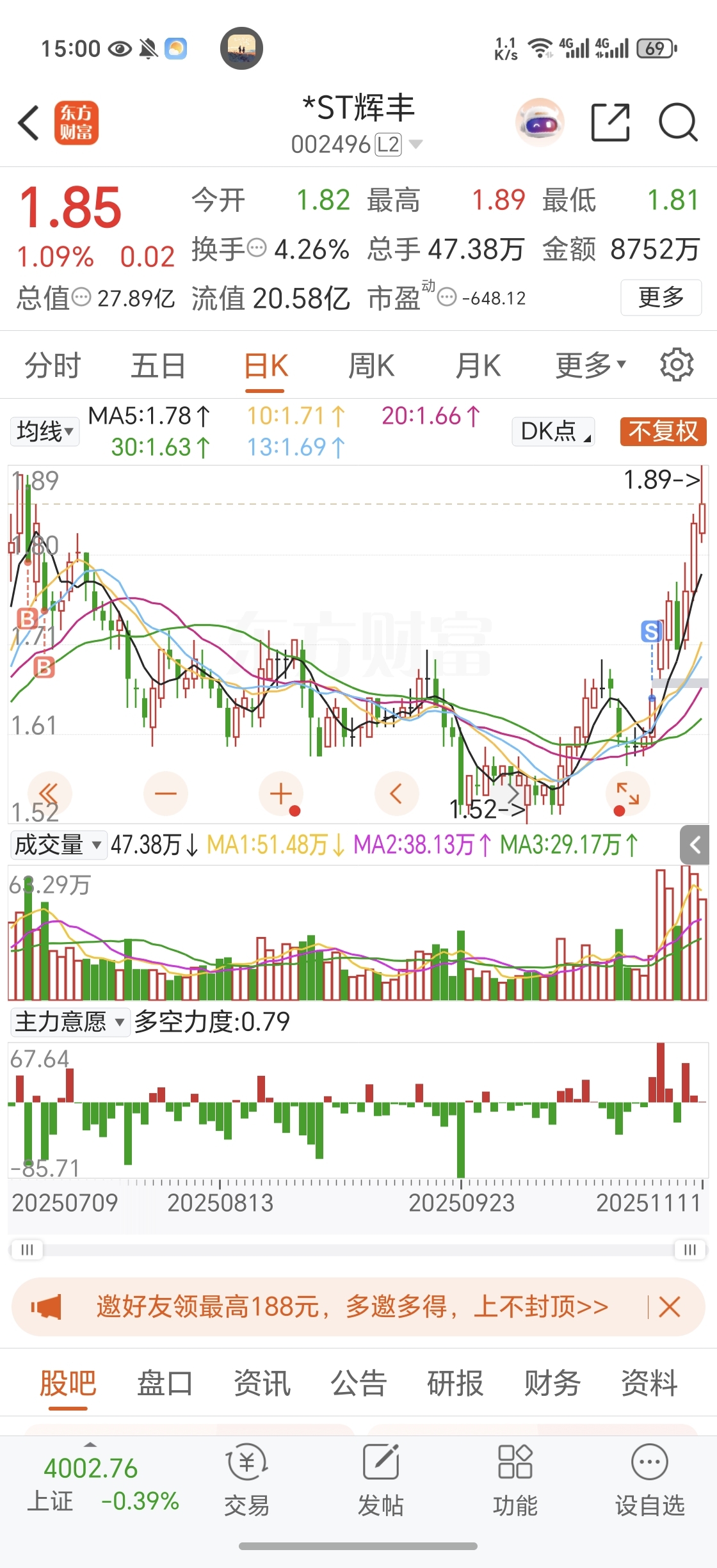 $*ST辉丰(SZ002496)$ 怎么又涨了,我还以为今天开始变盘呢
