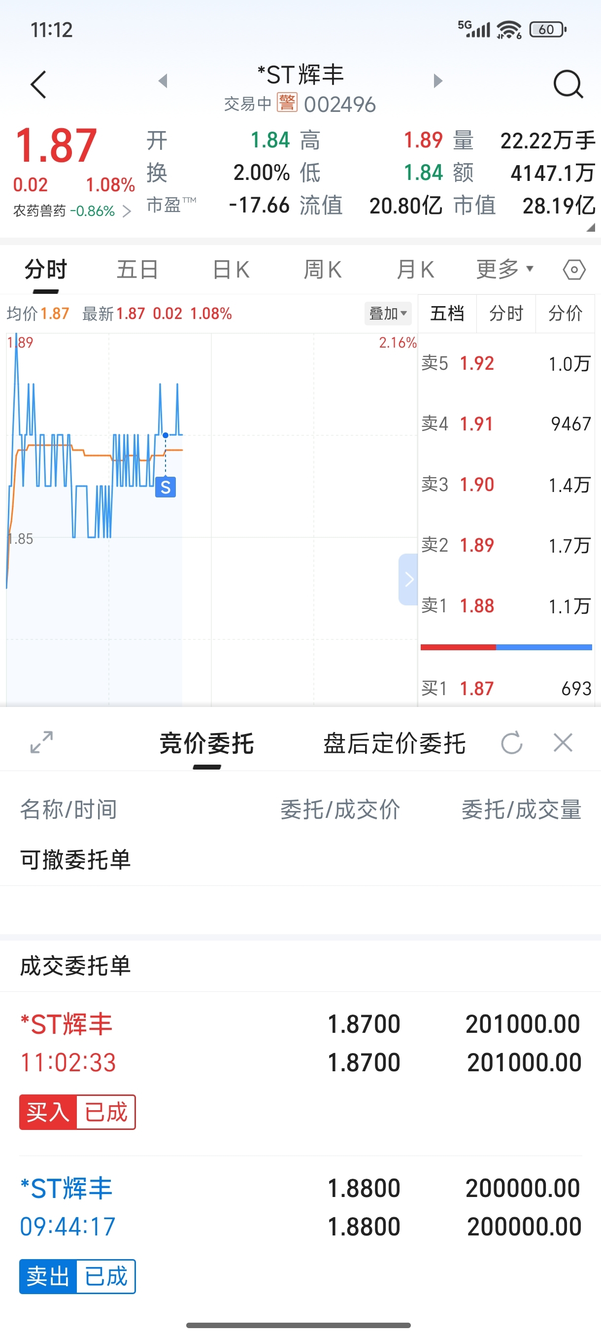 $*ST辉丰(SZ002496)$ 谢谢我又多买了1000股