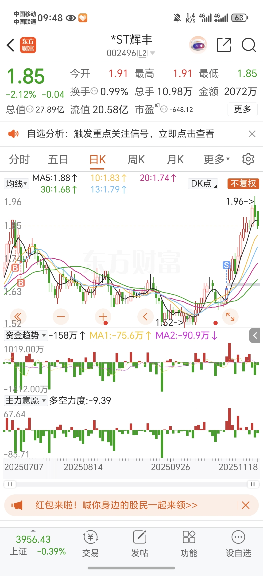 $*ST辉丰(SZ002496)$ 哈哈哈,跌回1.57我才买,向下趋势形成