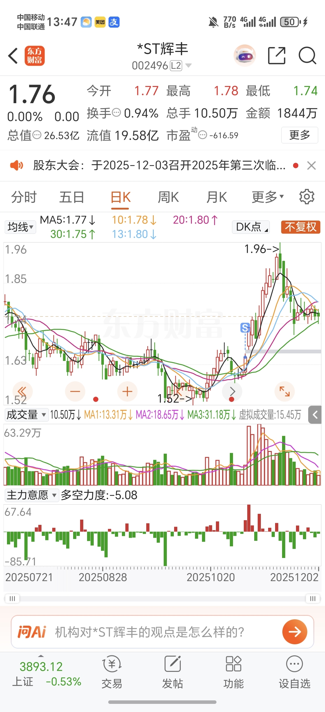 $*ST辉丰(SZ002496)$ 下来吧,补缺口,跌回1.57就买回来
