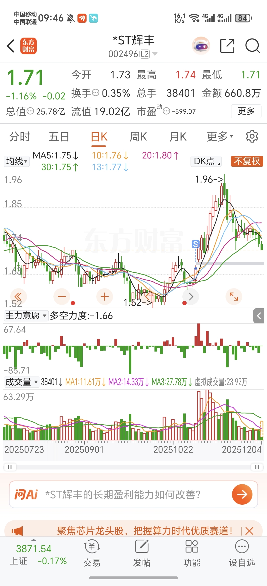 $*ST辉丰(SZ002496)$ 补缺口,1.57以下才能买