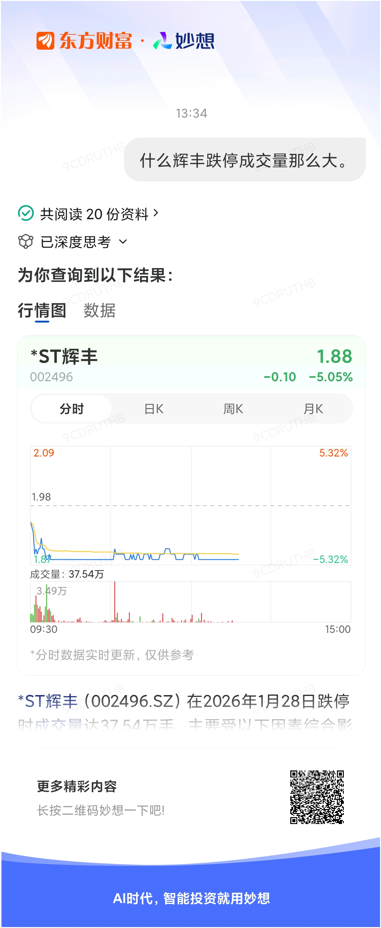 #@妙想,你怎么看?# 妙想一下:什么辉丰跌停成交量那么大。$*ST辉丰(SZ002496)$