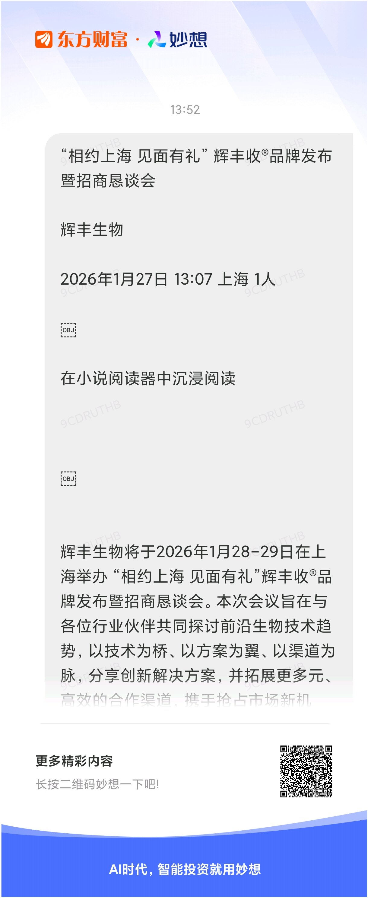 #@妙想,你怎么看?# $*ST辉丰(SZ002496)$ 妙想一下:“相约上海 见面有礼” 辉丰收品牌发布暨招商恳谈会 辉丰生物 2026年1月27日 13:07 上海 1人 在小说阅读器中沉浸阅读辉丰生物将于2026年1月28-29日在上海举办 “相约上海 见面有礼”辉丰收品牌发布暨招商恳谈会。本次会议旨在与各位行业伙伴共同探讨前沿生物技术趋势,以技术为桥、以方案为翼、以渠道为脉,分享创新解决方案,并拓展更多元、高效的合作渠道,携手抢占市场新机遇!本次恳谈会将集中展示辉丰收品牌系列产品,以小分子功能肥“底+追+喷”系列、腐植酸新品、复合肥、大量元素水溶肥等前沿产品,通过果品品鉴及使用效果视频、专家报告、客户分享等环节,直观呈现技术创新带来的提质增产成效。辉丰生物(股票代码:002496)深耕农业领域38年,坚守“土壤健康、作物健康、人类健康”战略定位,以“两增两好抗重茬专家”为品牌核心,打造了涵盖小分子功能肥等系列优质产品。分析一下利好