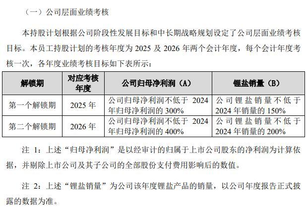 在第一个解锁期对应的考核年度2025年,公司归母净利润目标不低于2024年归母净利润的300%,及公司锂盐销量目标不低于2024年销量的150%。
