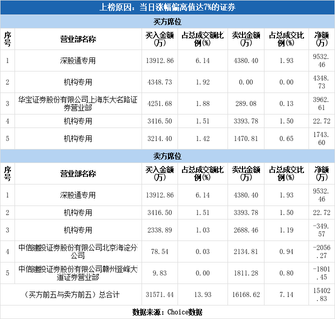 今日龙虎榜单上出现了深股通的身影,占据了买一、卖一的位置,净买入9532.46万元,占当日成交总额的4.21%。