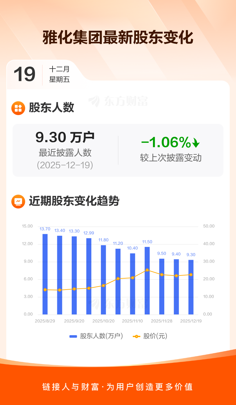 雅化集团最新披露数据显示,截至12月19日公司股东户数为9.30万户,较上期(2025年12月10日)减少1000户,降幅为1.06%。户均持有流通股数量由上期的1.13万股上升至1.14万股,户均持股金额由上期的24.74万元增加至25.71万元。