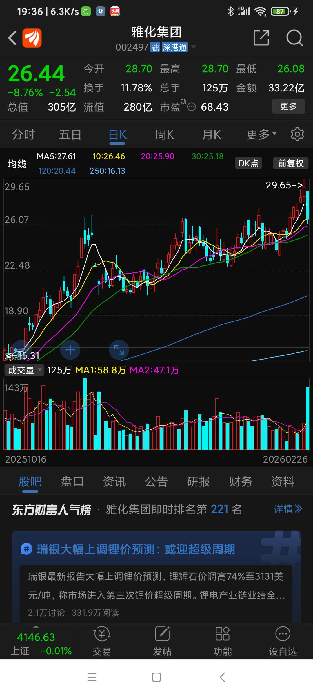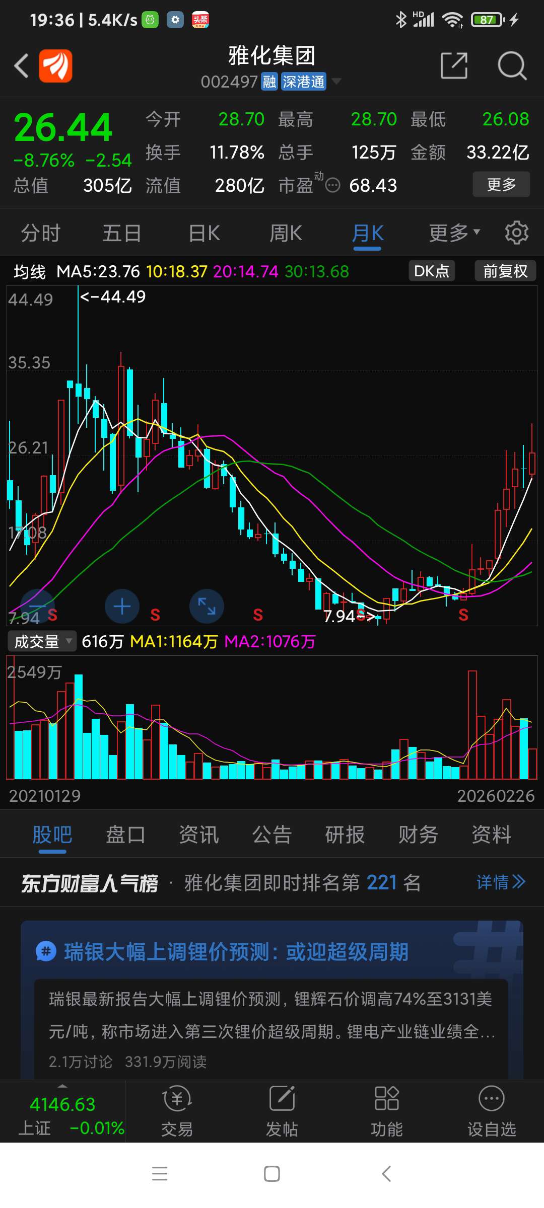 由于受非州国家津巴布韦暂时禁止锂矿出口利空消息影响,雅化集团今日大跌。