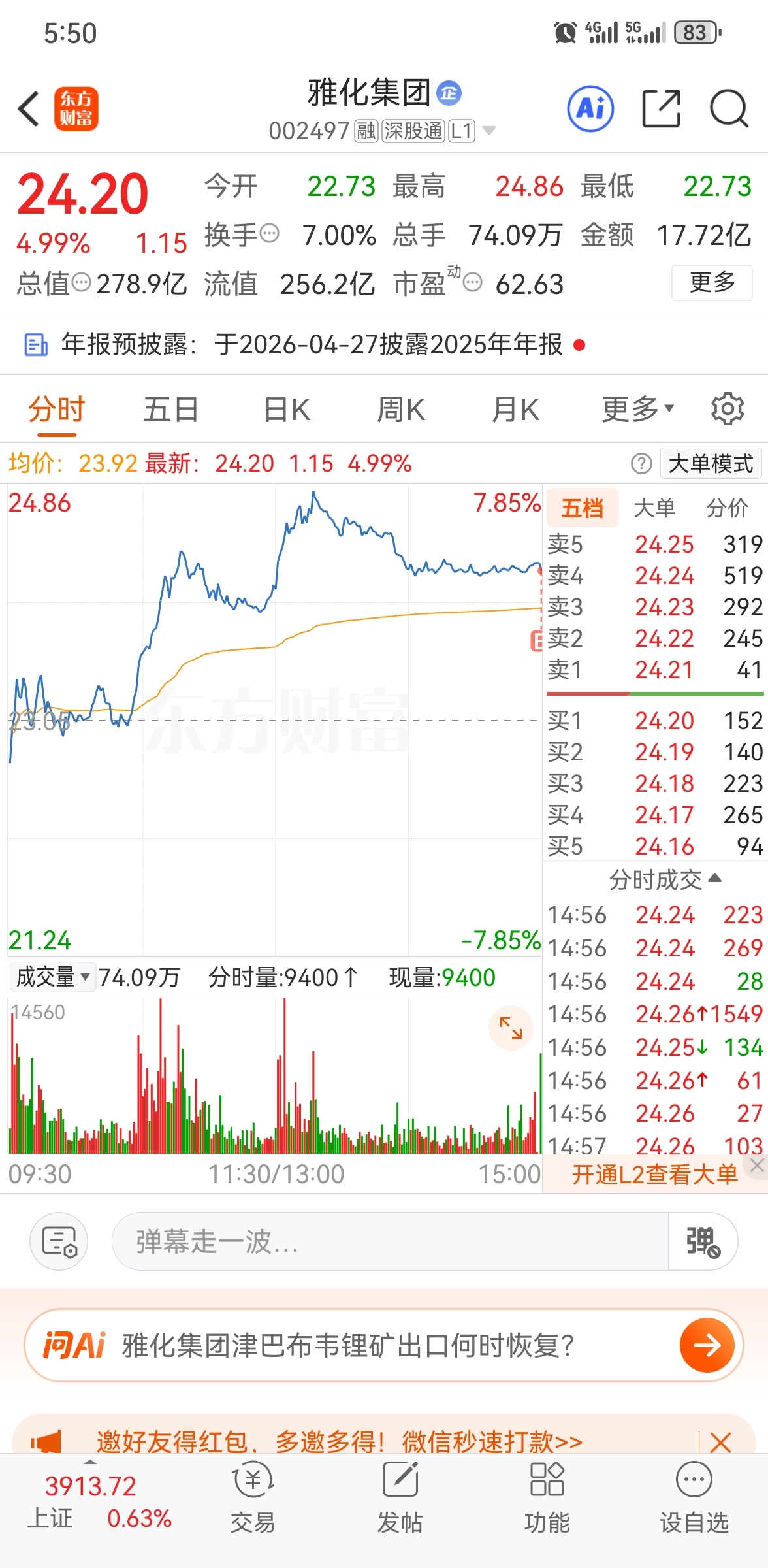 $雅化集团(SZ002497)$ 今日有时间买入操作,复盘后给出隔日大概率见红标的。3月27日尾盘买入