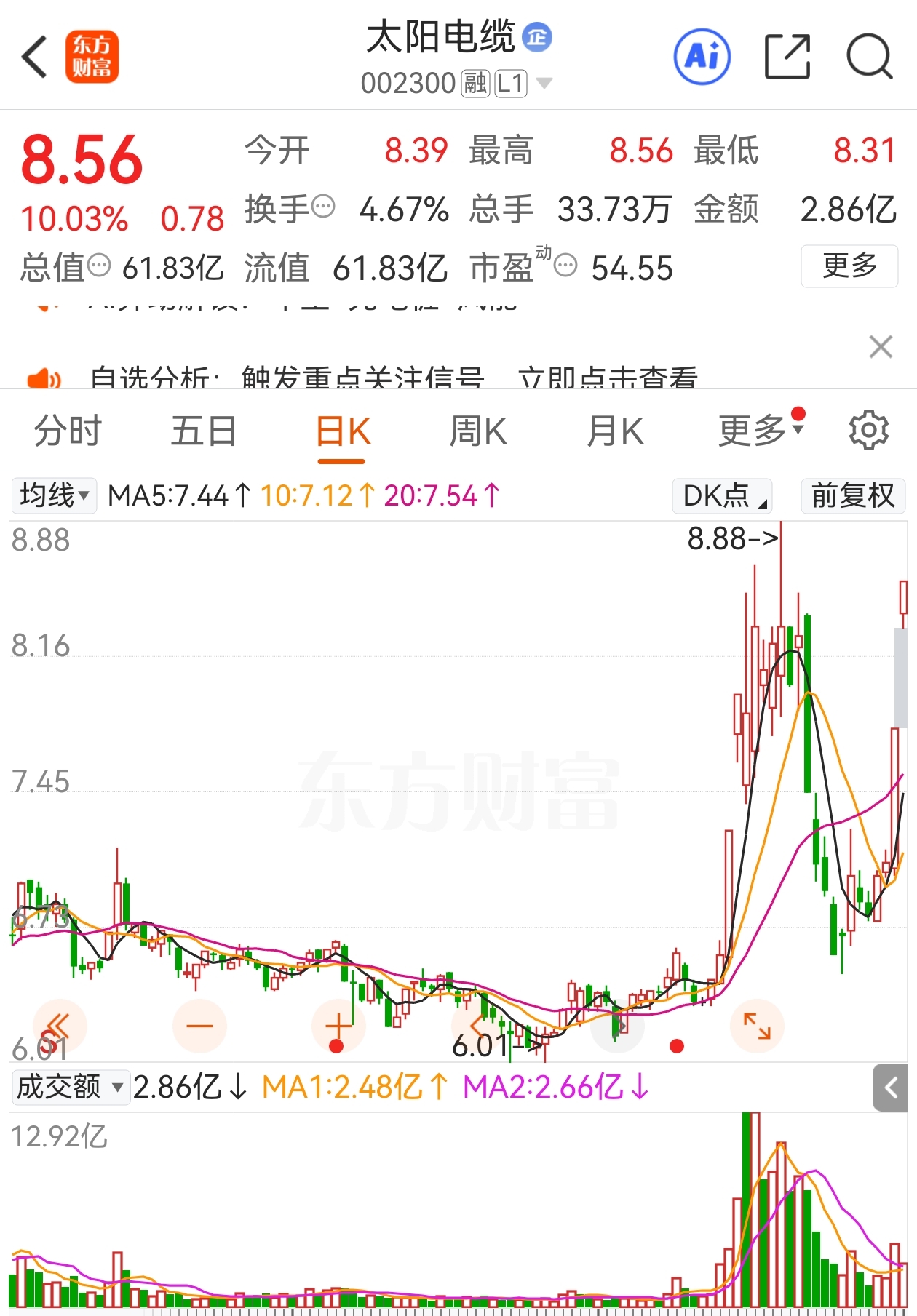 $汉缆股份(SZ002498)$ 太阳电缆已经涨回高点,这玩意是涨不回去了,太阳电缆一开板此股必跳水。